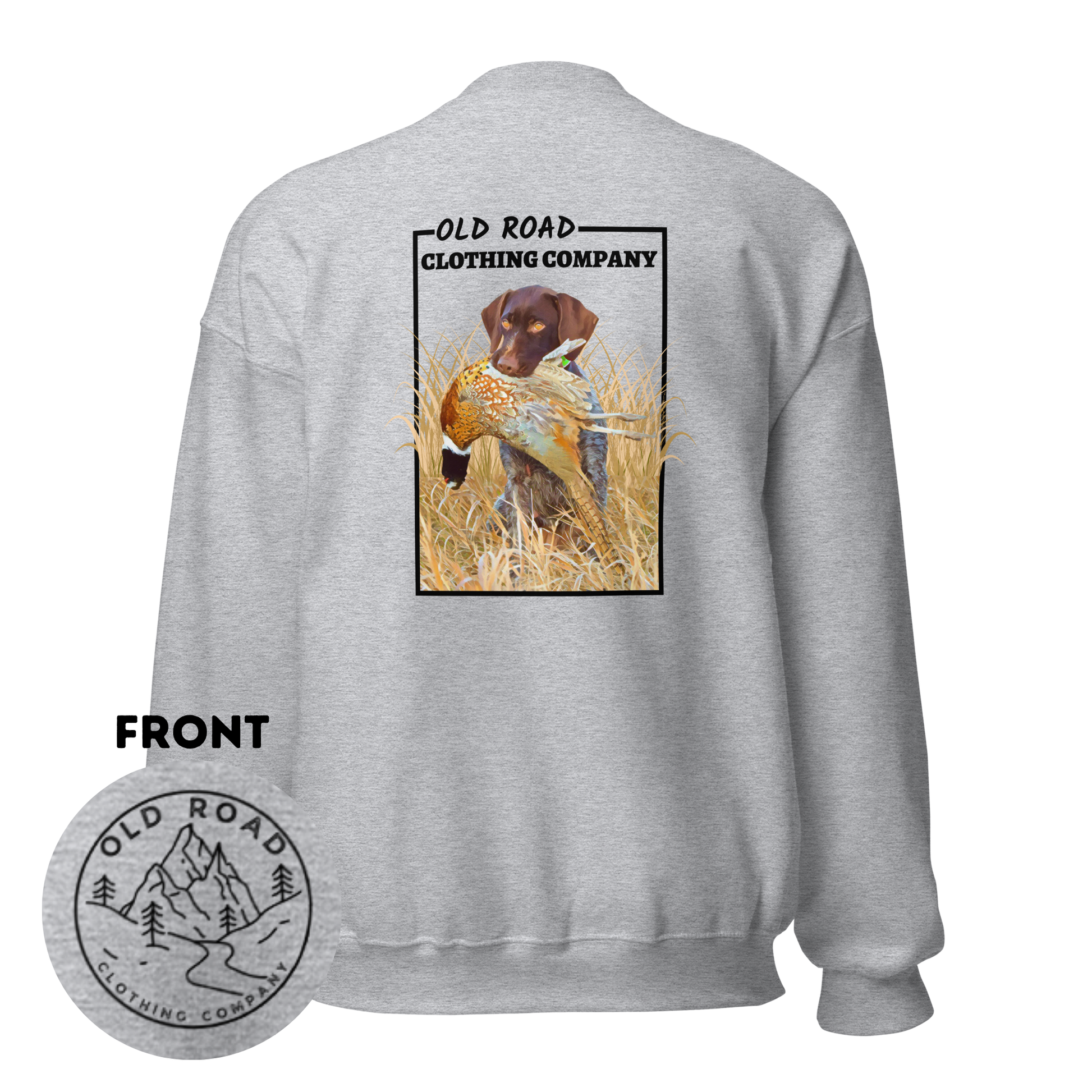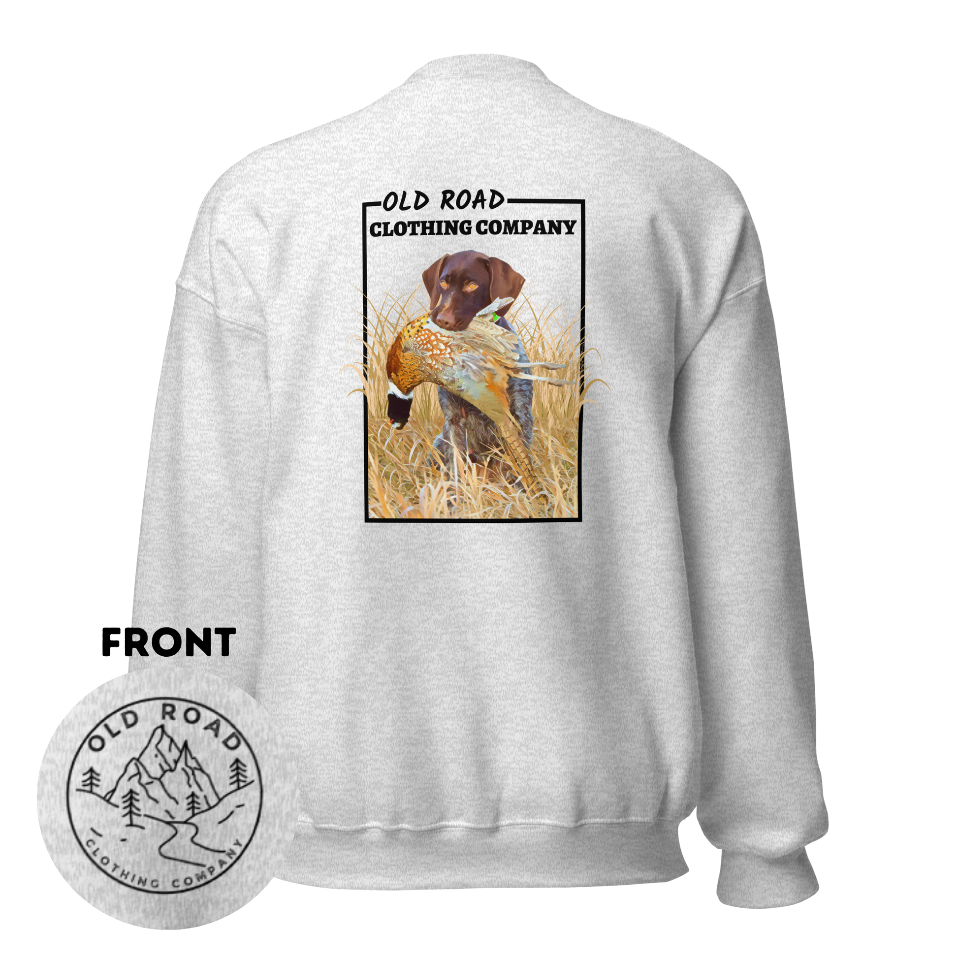 This crewneck is made for a GSP owner that loves to hunt. The back of the hoodie features a German Shorthaired Pointer dog in a field holding a pheasant in its mouth after retrieving it for his hunter. This is framed with our outdoors brand "Old Road Clothing Company." The front of the shirt has our Old Road Clothing Company Logo.