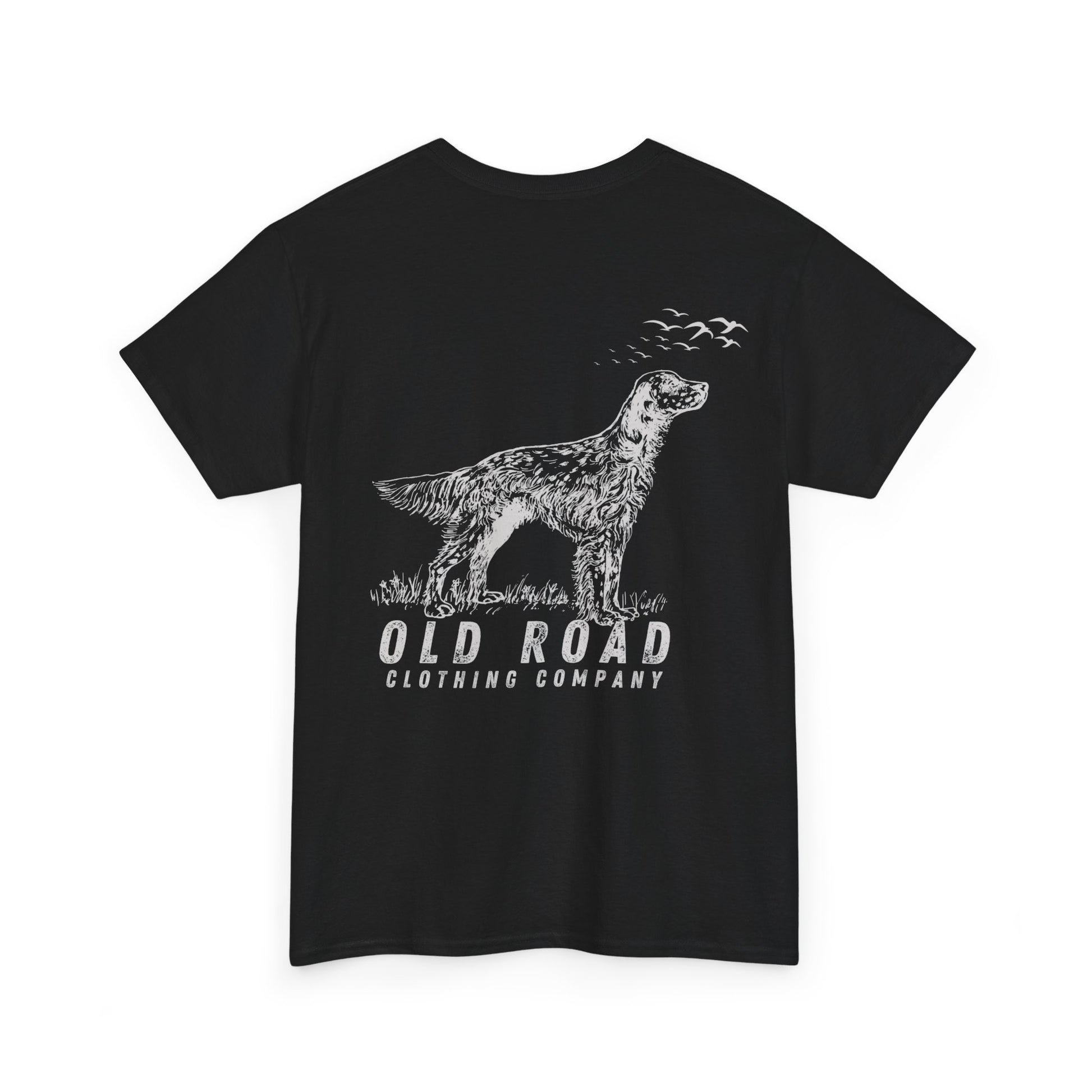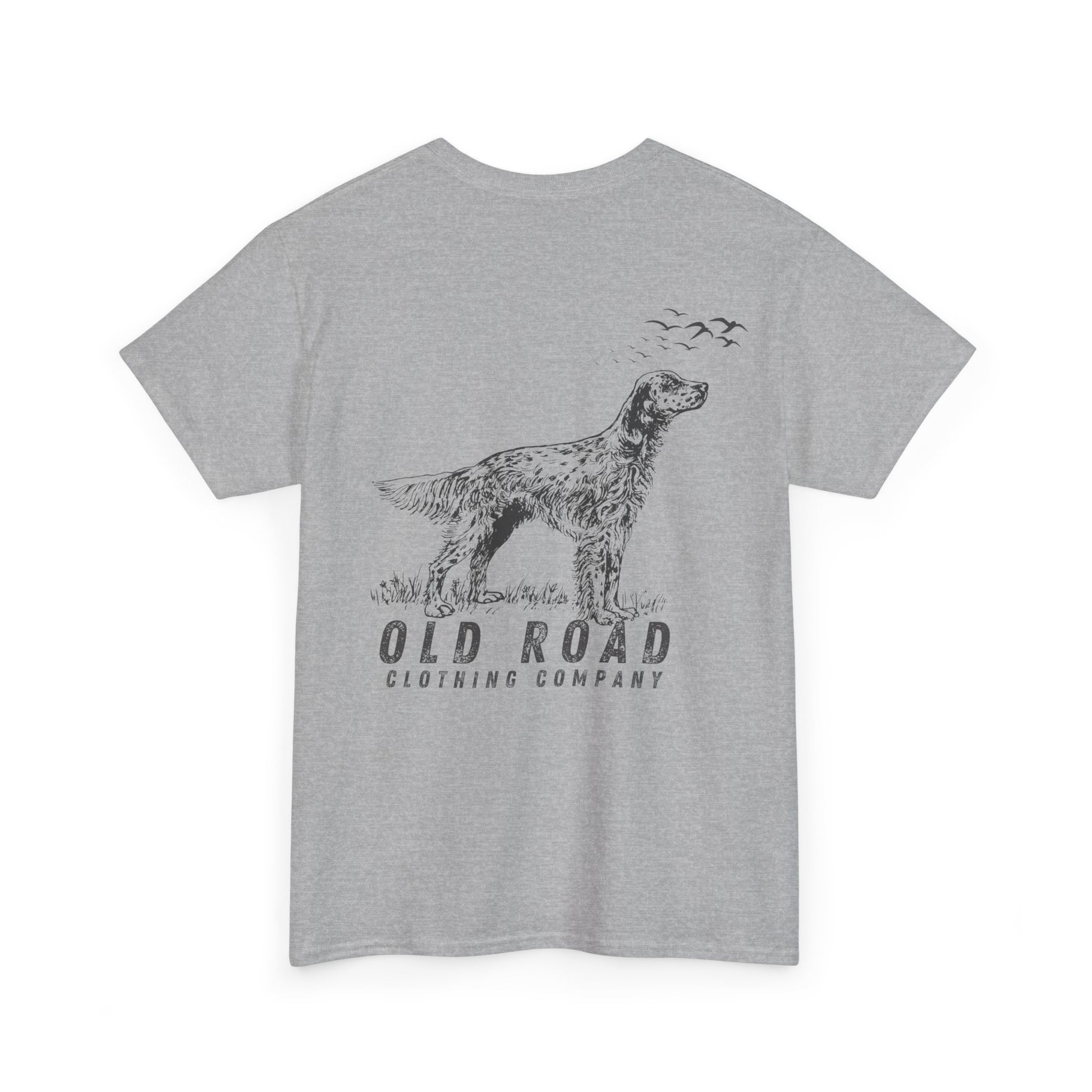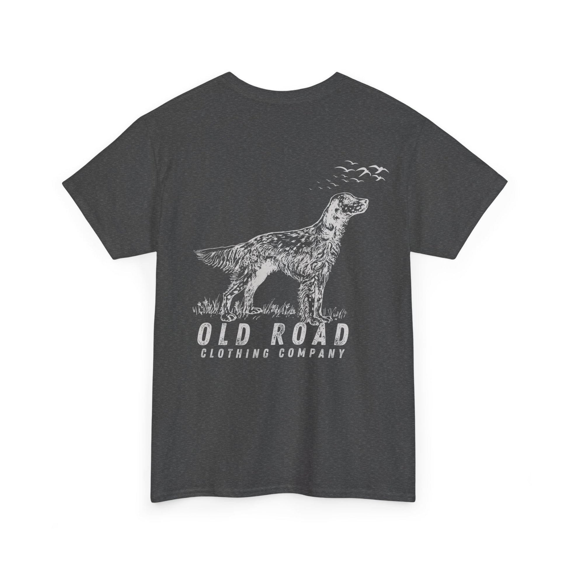 Unisex Fit, Please review size chart. This is a Gildan shirt with our Old Road Clothing Company logo printed on the front and an English Setter with birds flying above it on the back.