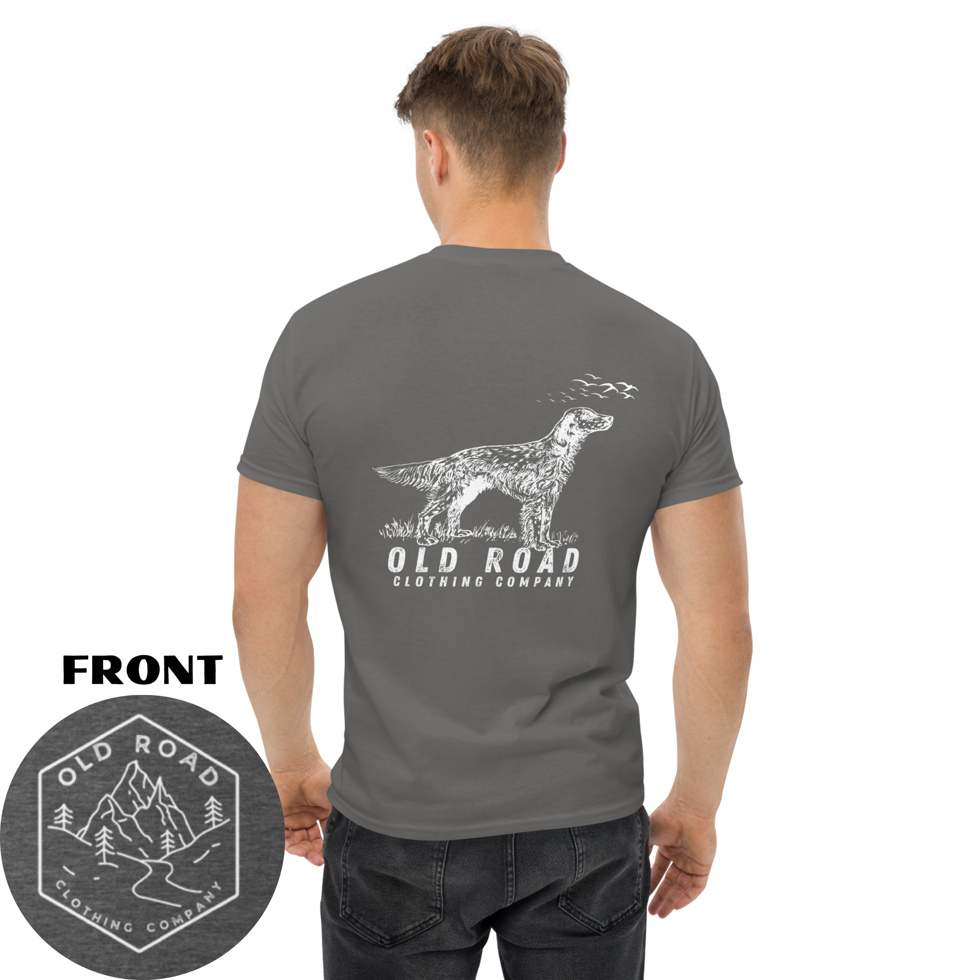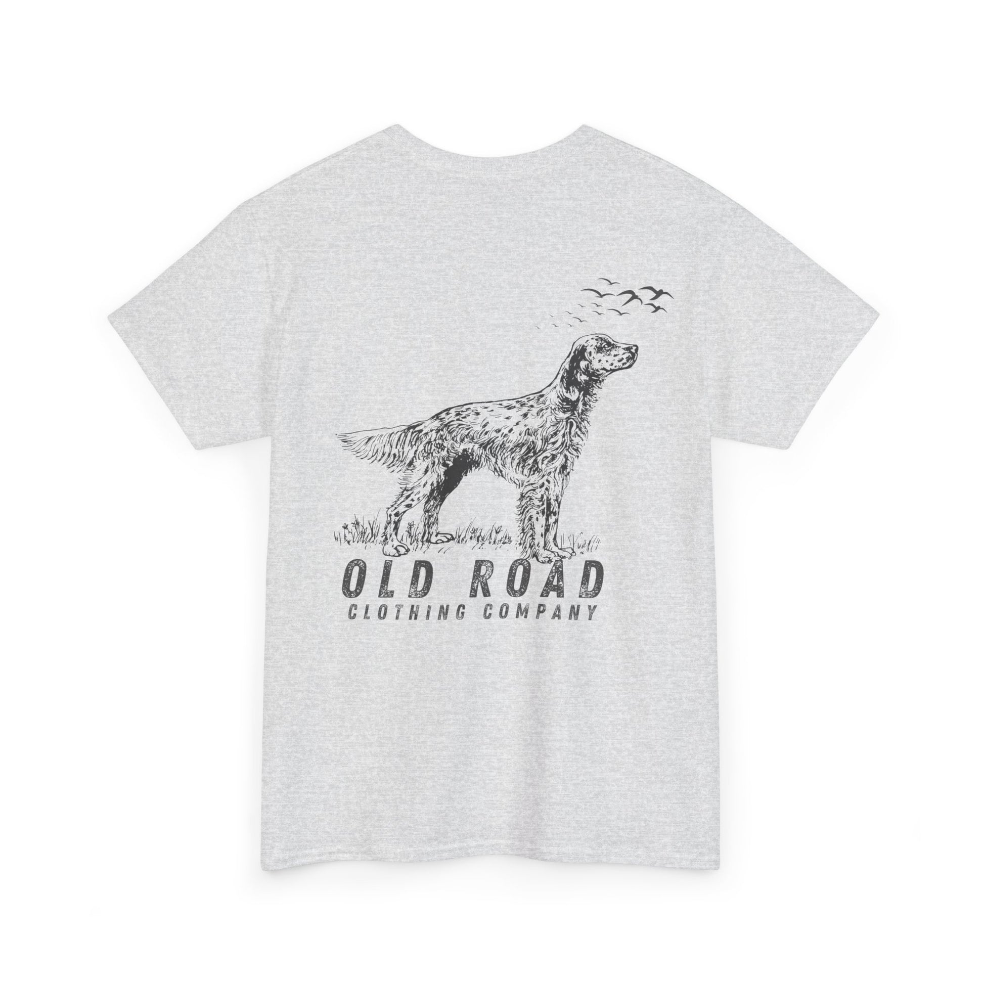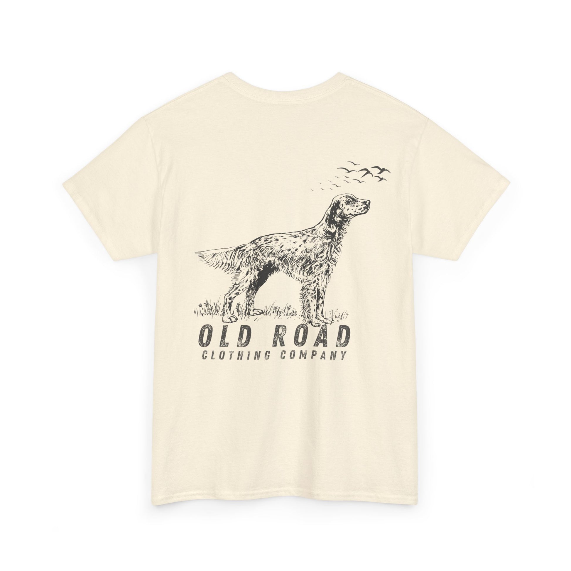 Unisex Fit, Please review size chart. This is a Gildan shirt with our Old Road Clothing Company logo printed on the front and an English Setter with birds flying above it on the back.