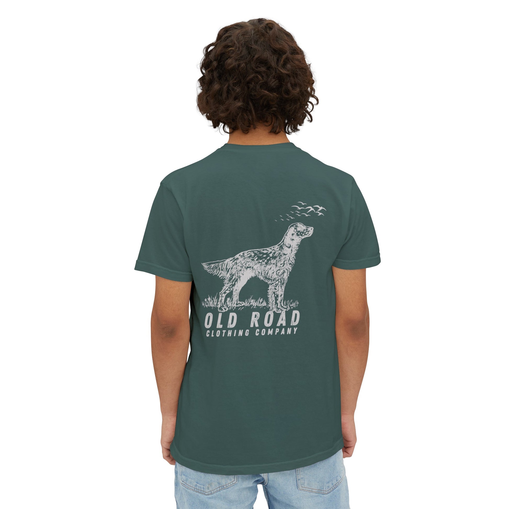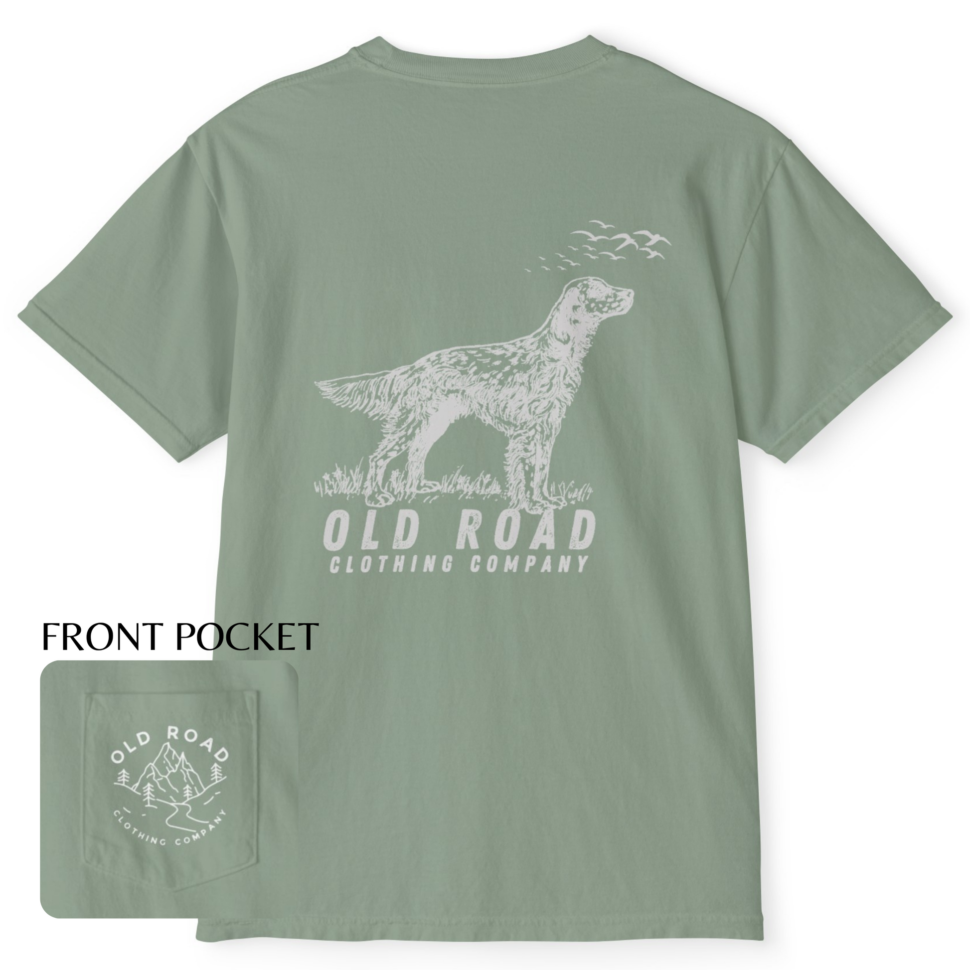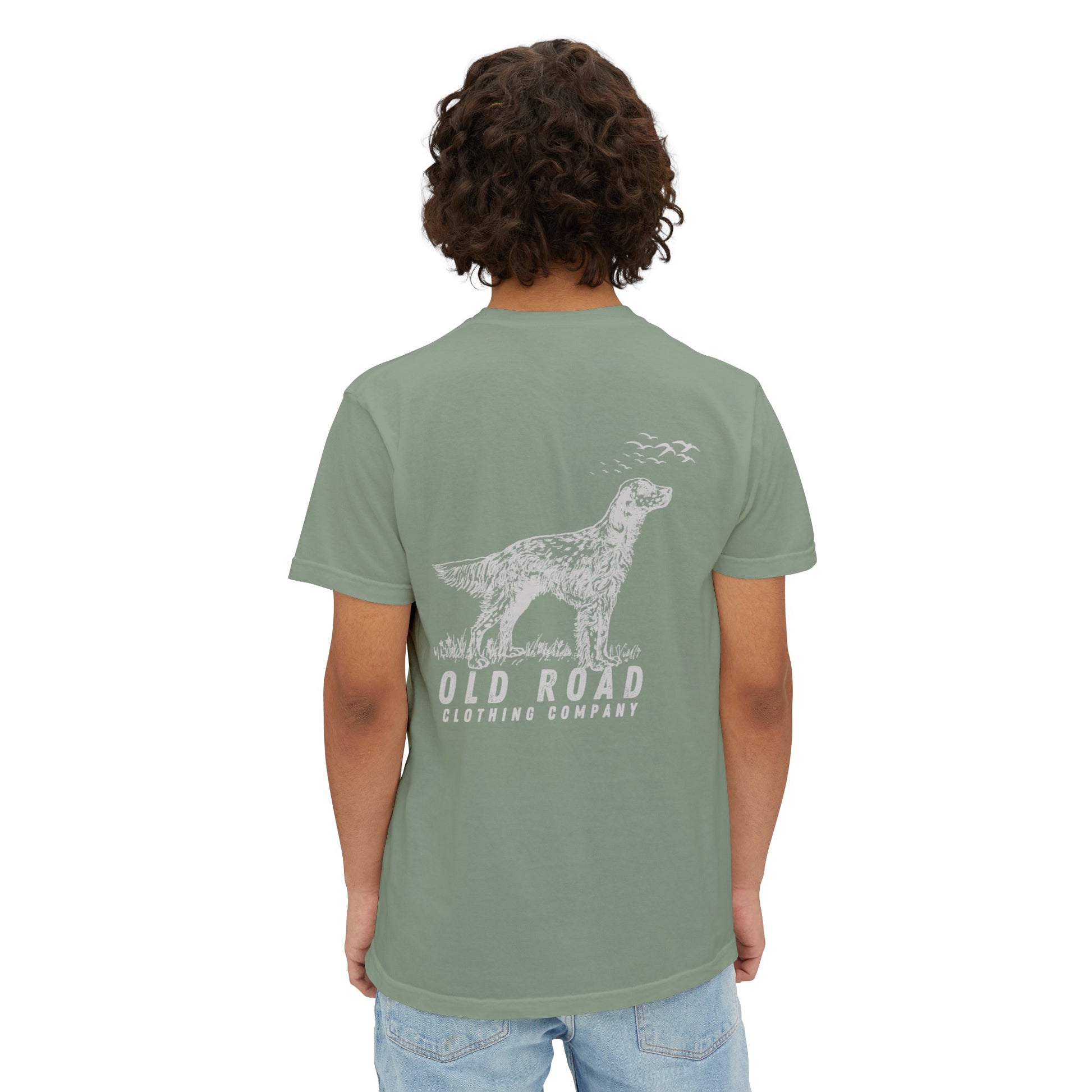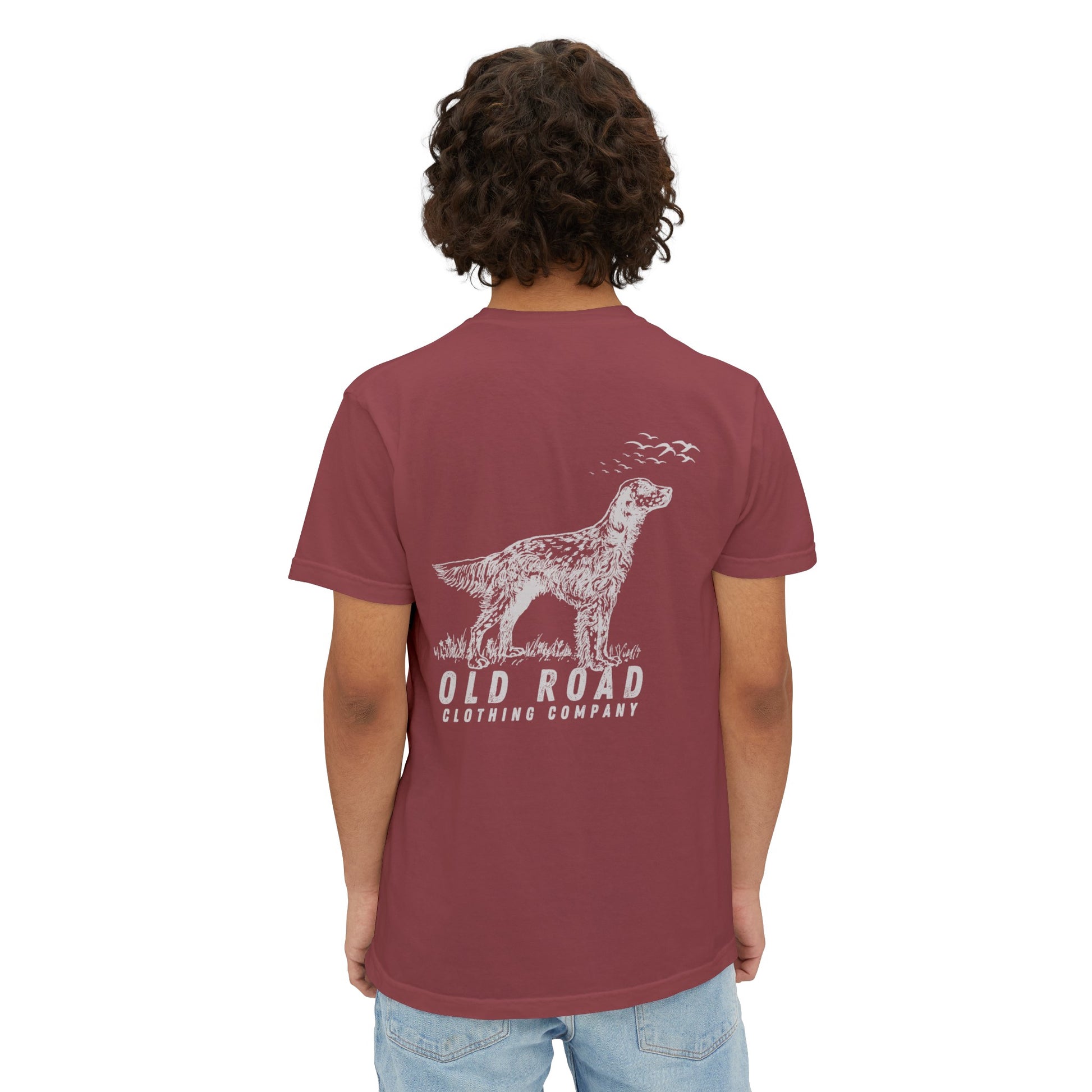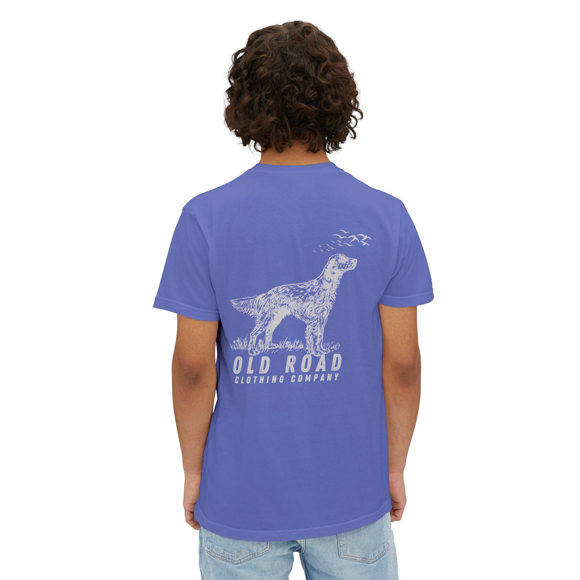 This T shirt is a comfort colors pocket tee. Our Old Road Clothing Company logo in on the front pocket and a picture of an english setter is on the back. These T shirt are unisex sizing, please review size chart before purchasing.