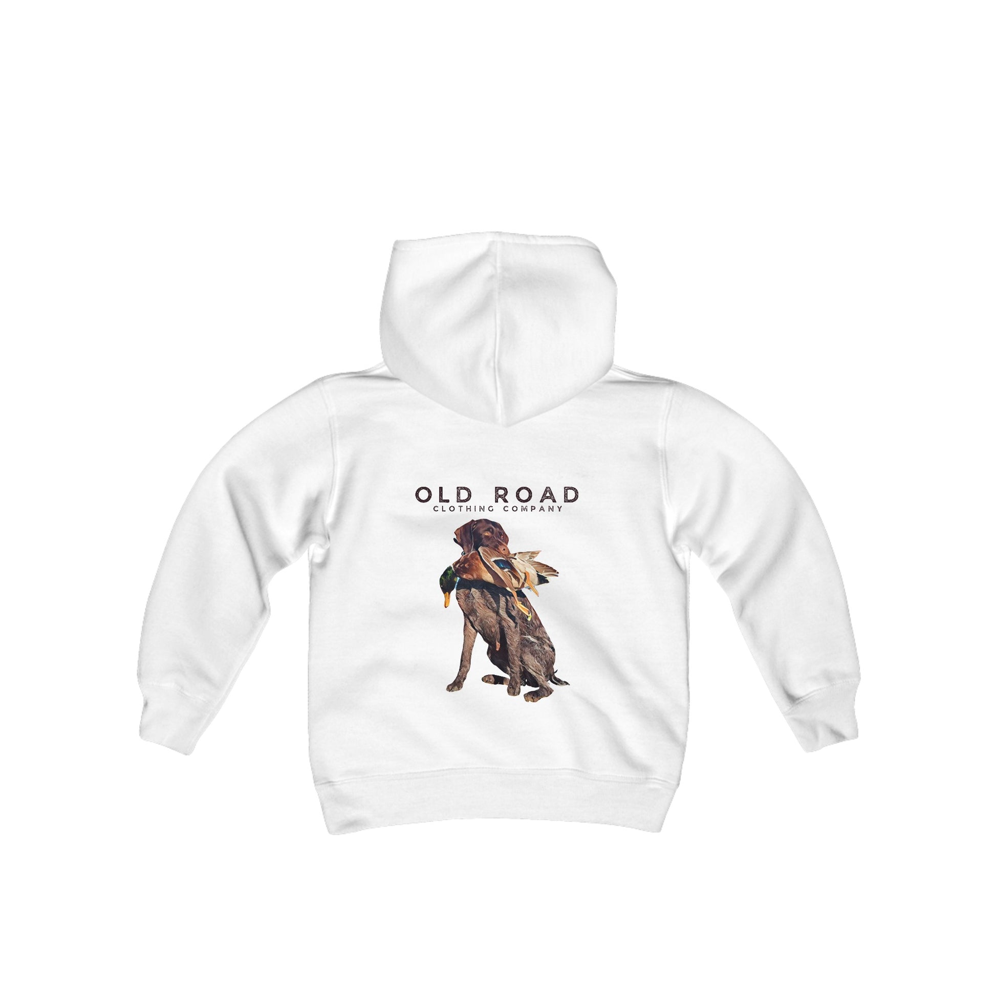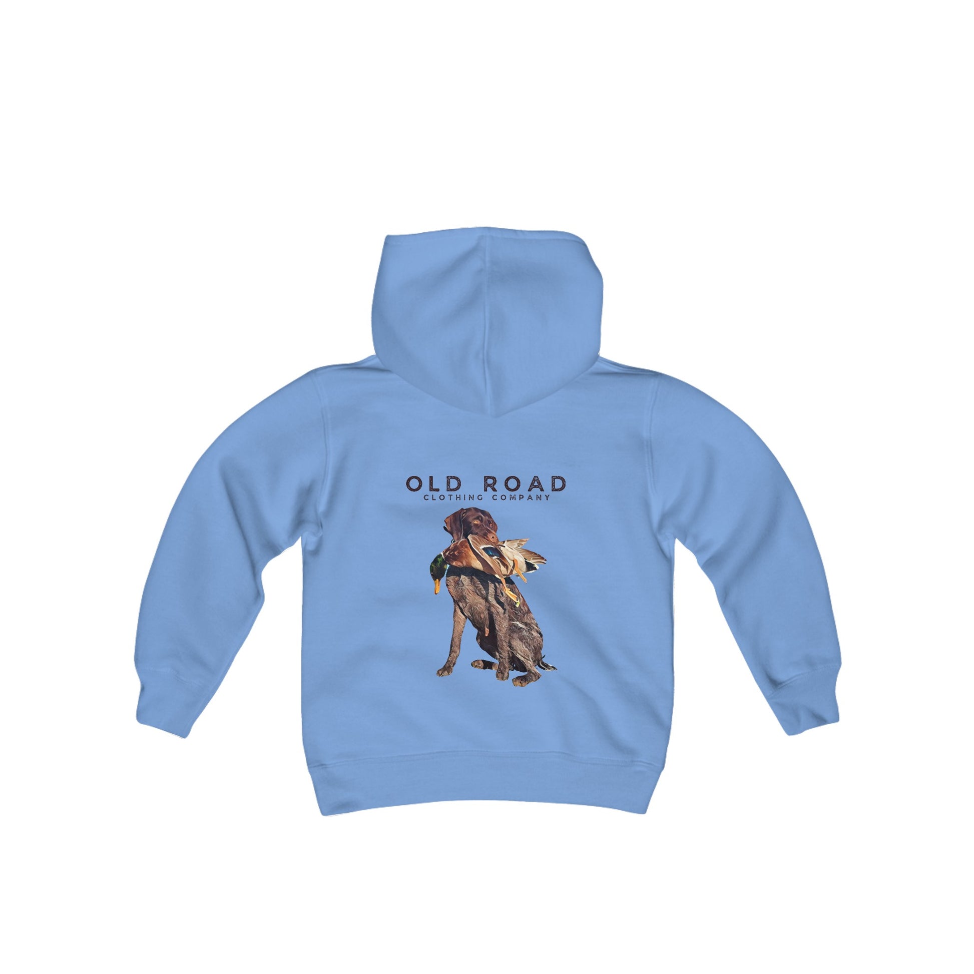 This shirt has our Old Road Clothing Company logo on the front and a German Wirehaird Pointer dog holding a duck in its mouth on the back. We offer this design on adult hoodies and t shirts.