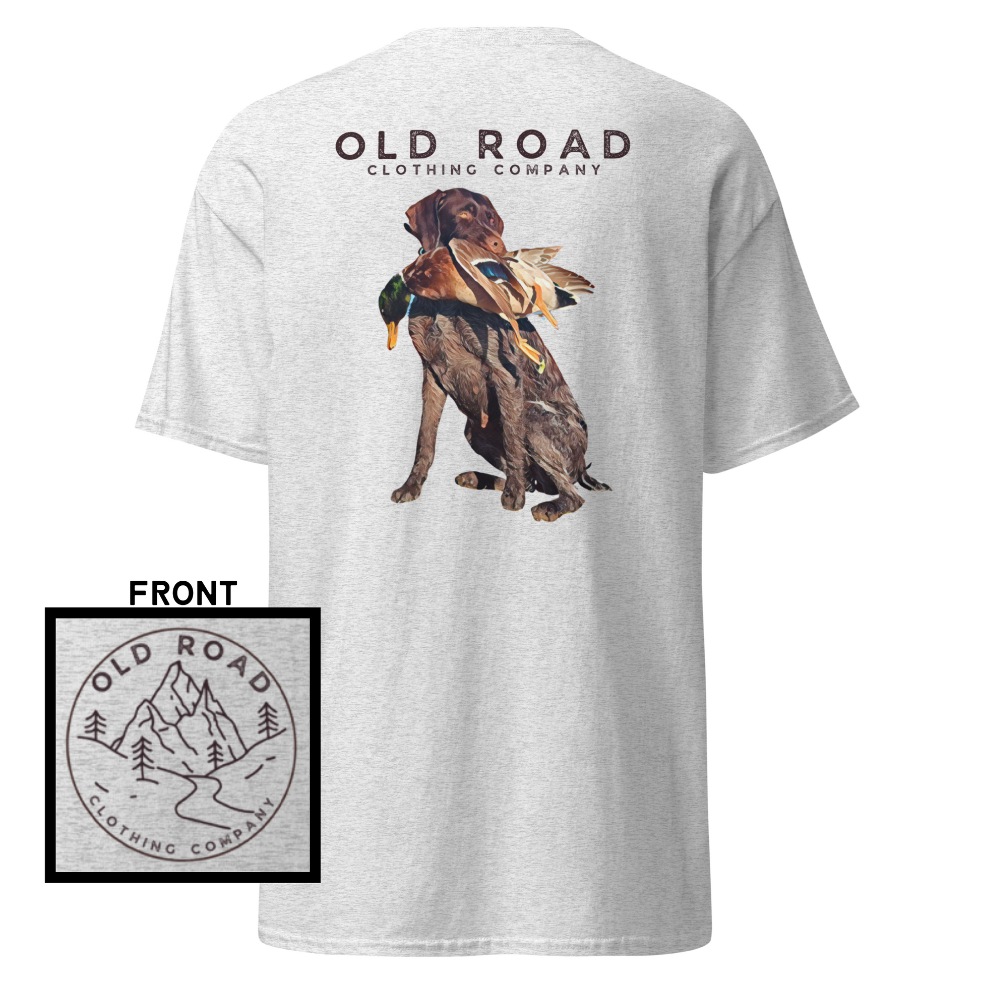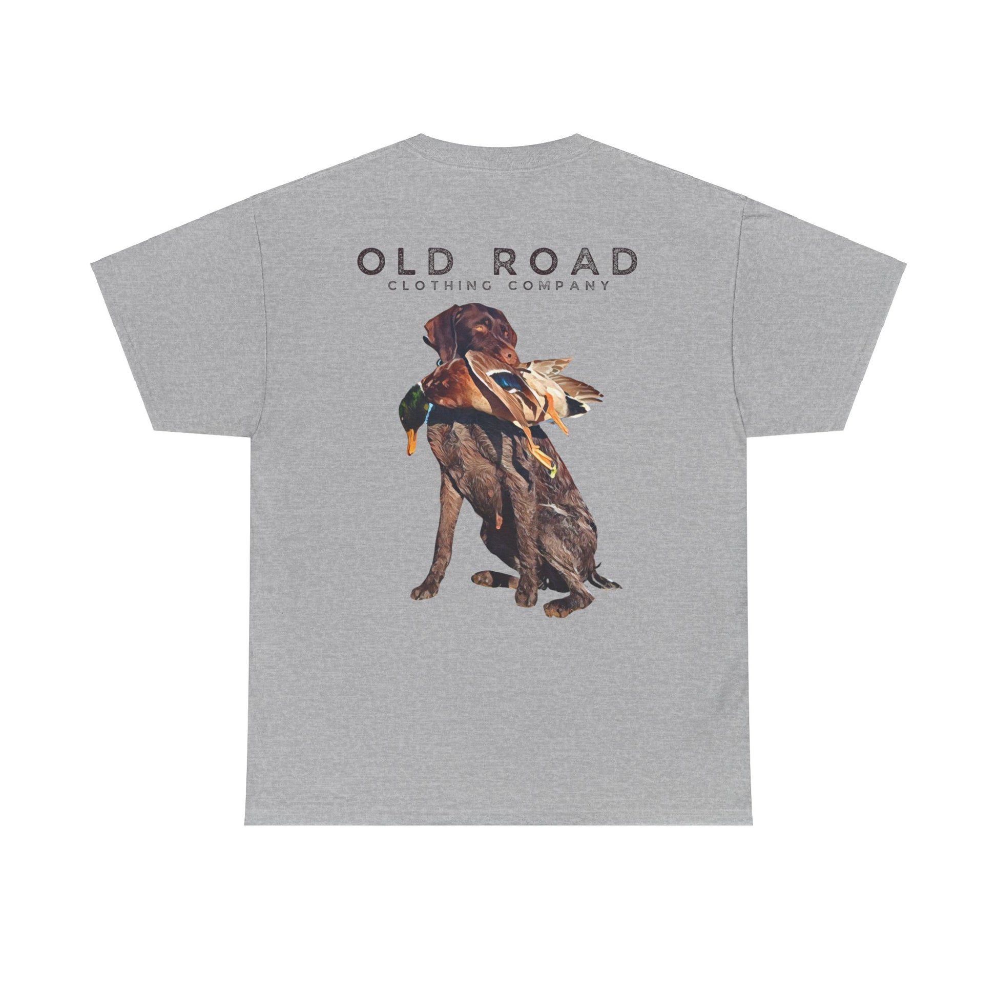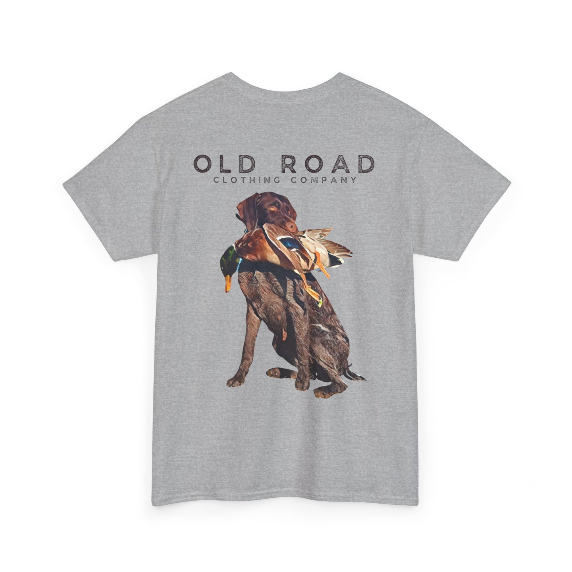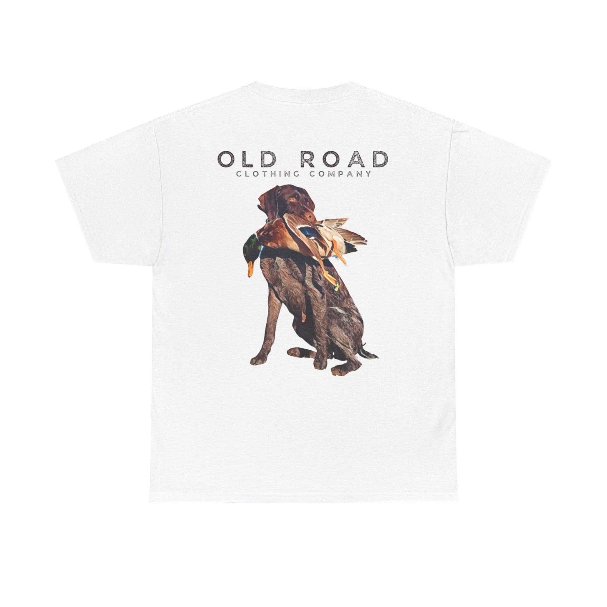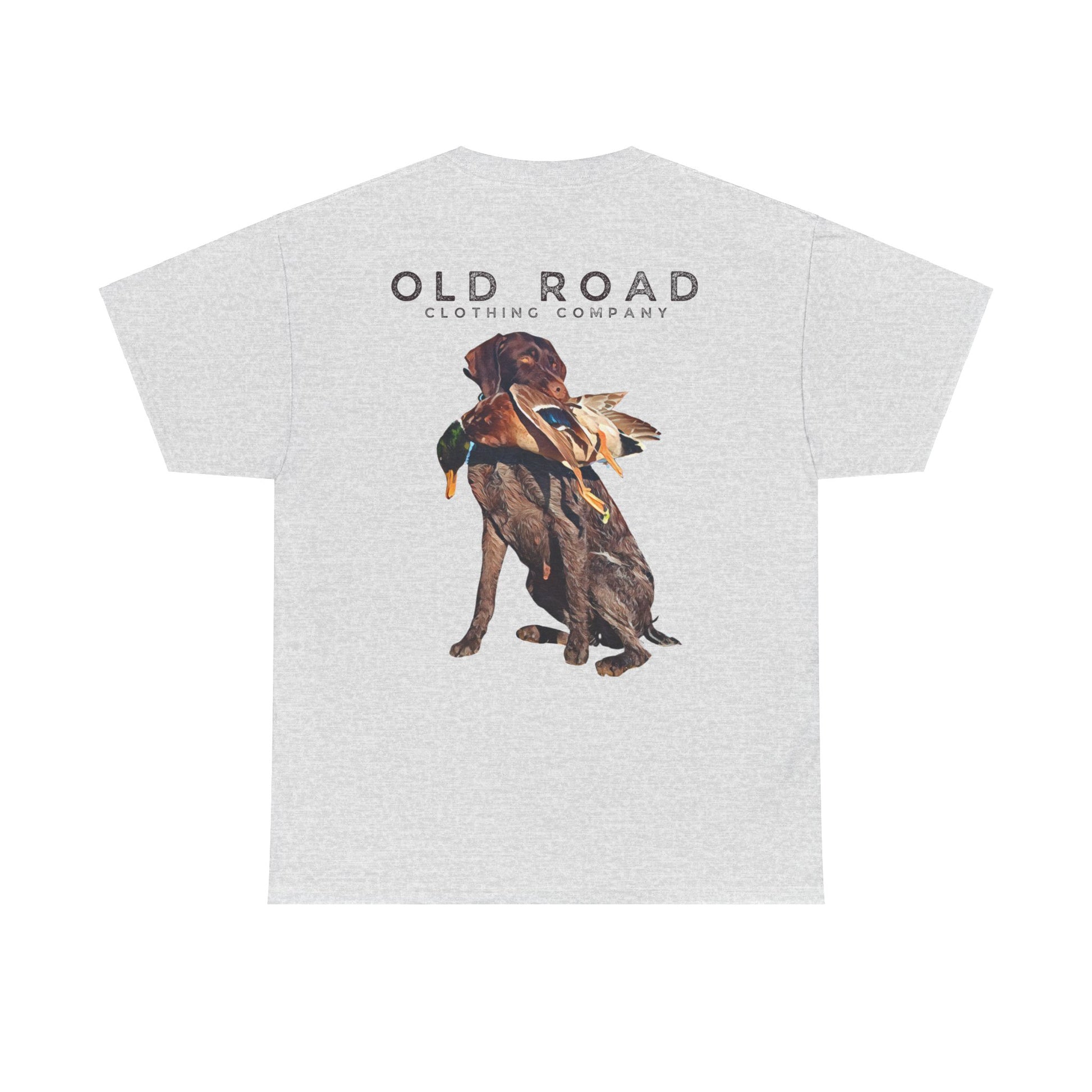 This shirt has our Old Road Clothing Company logo on the front and a German Wirehaird Pointer dog holding a duck in its mouth on the back.
