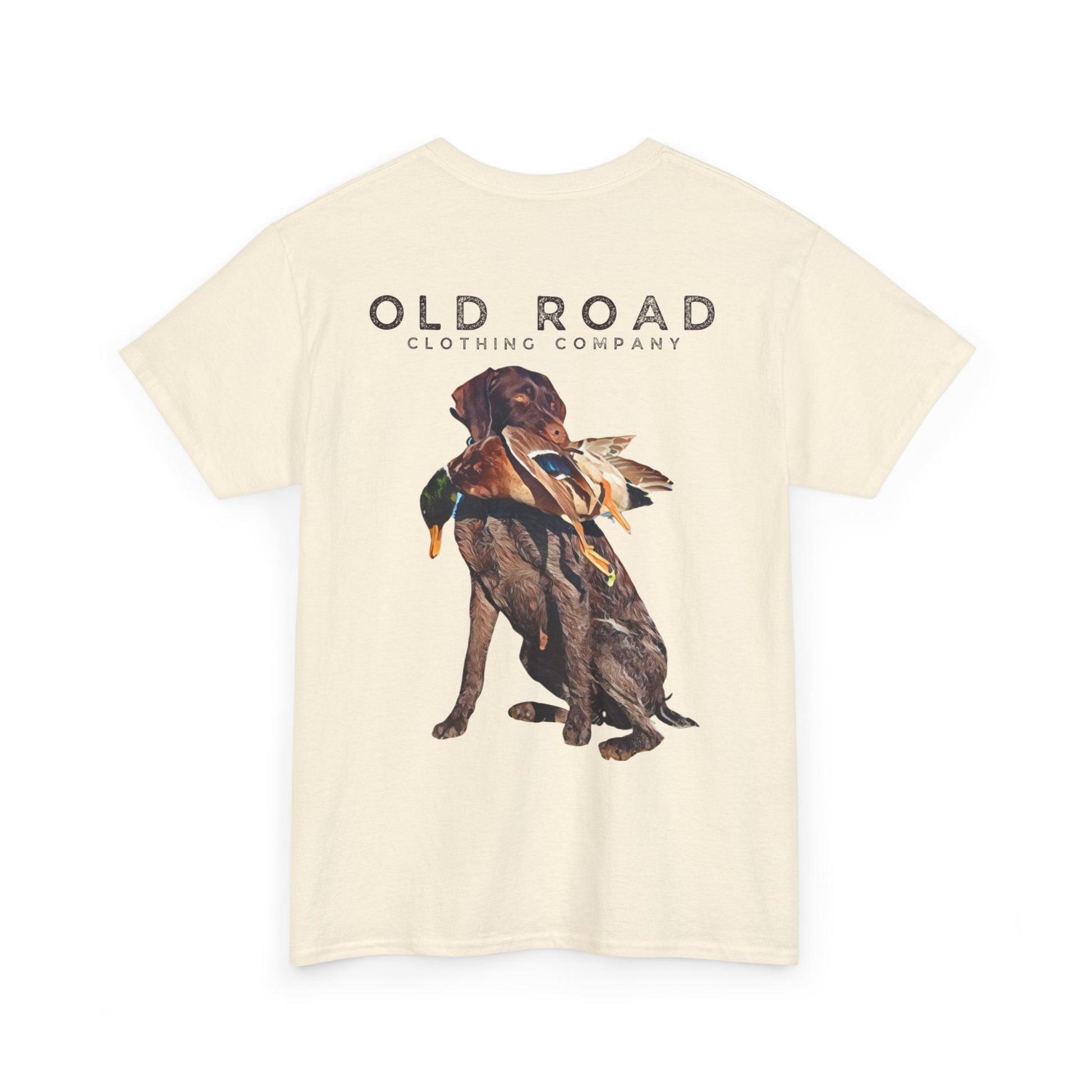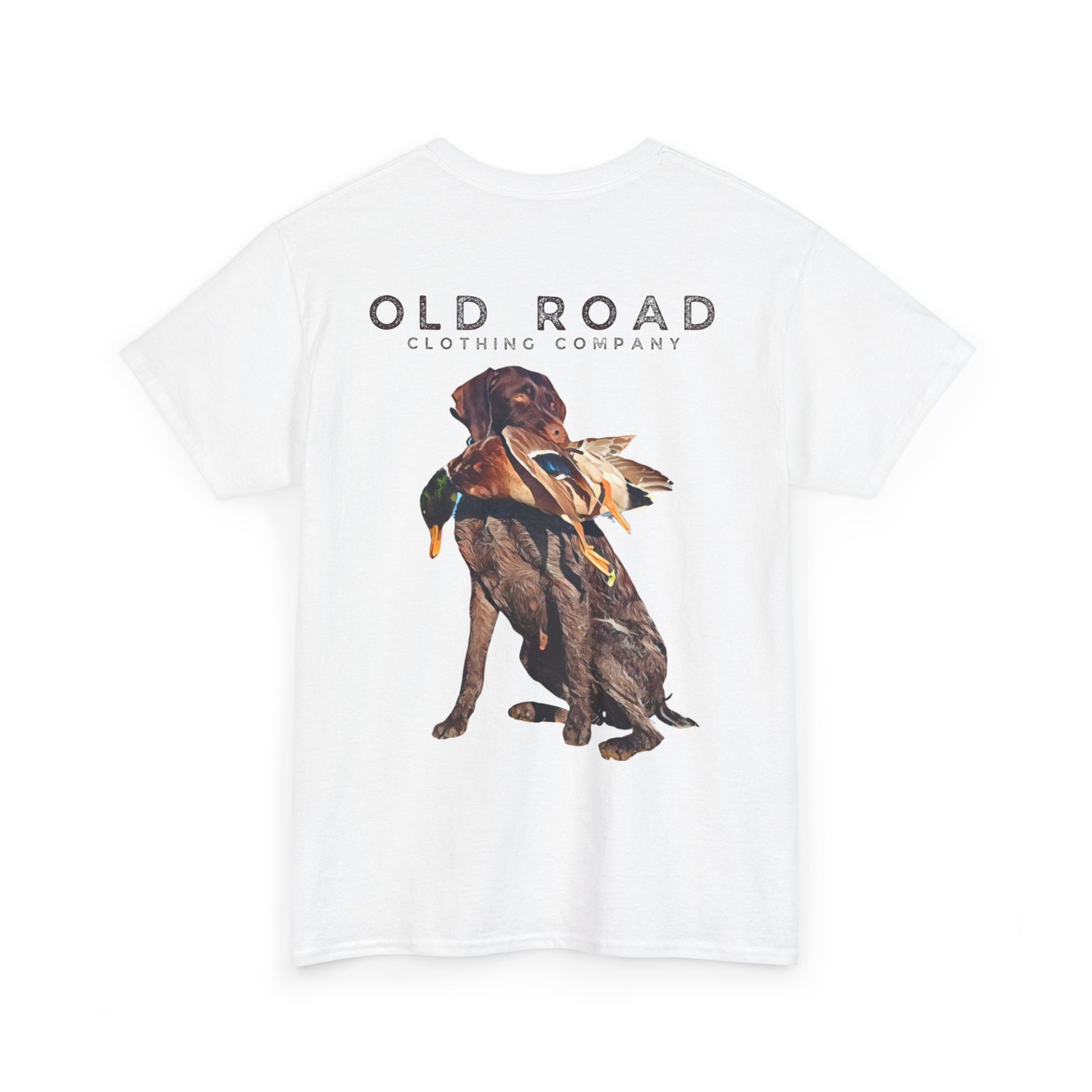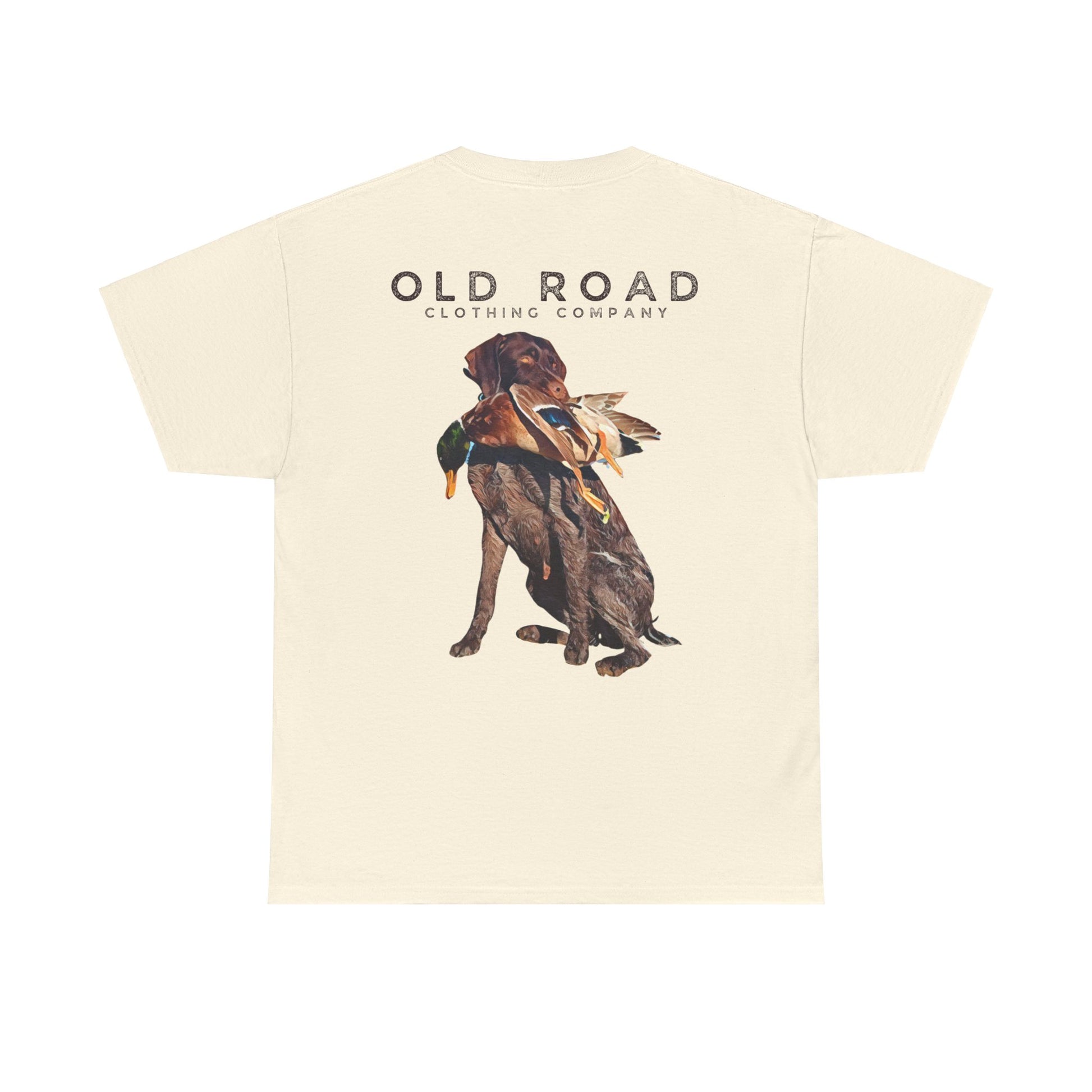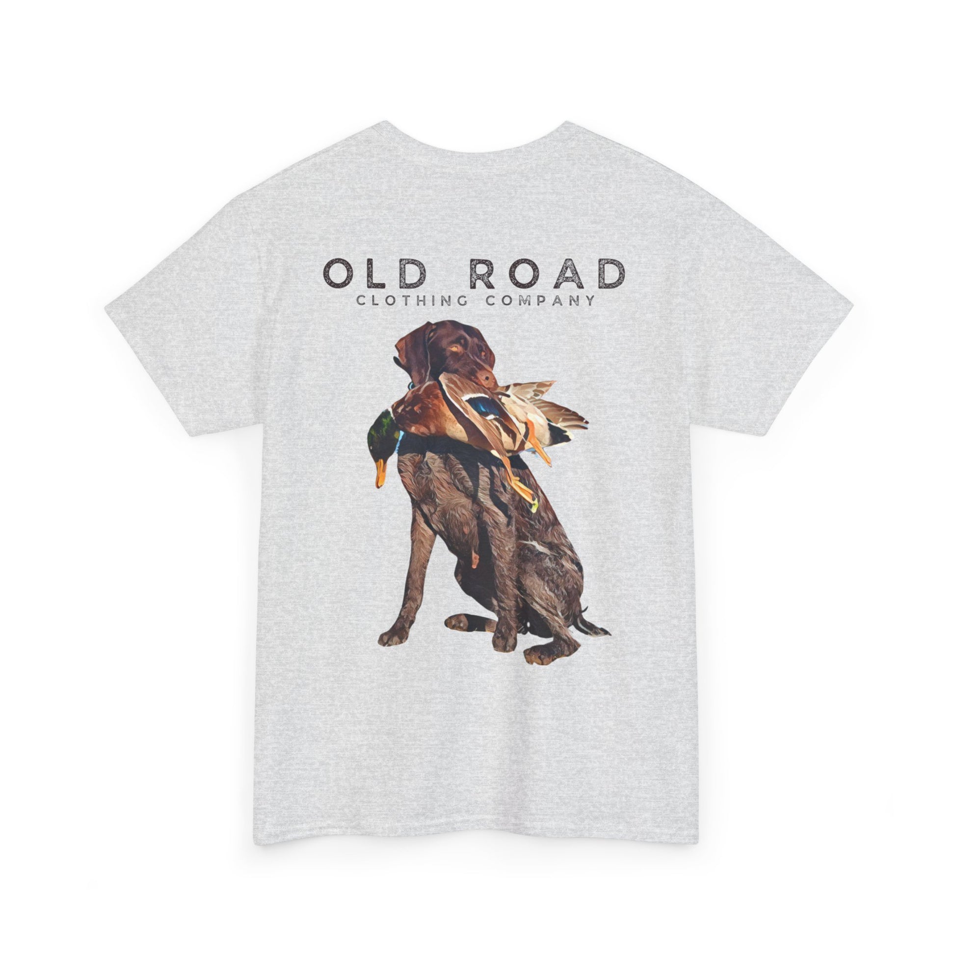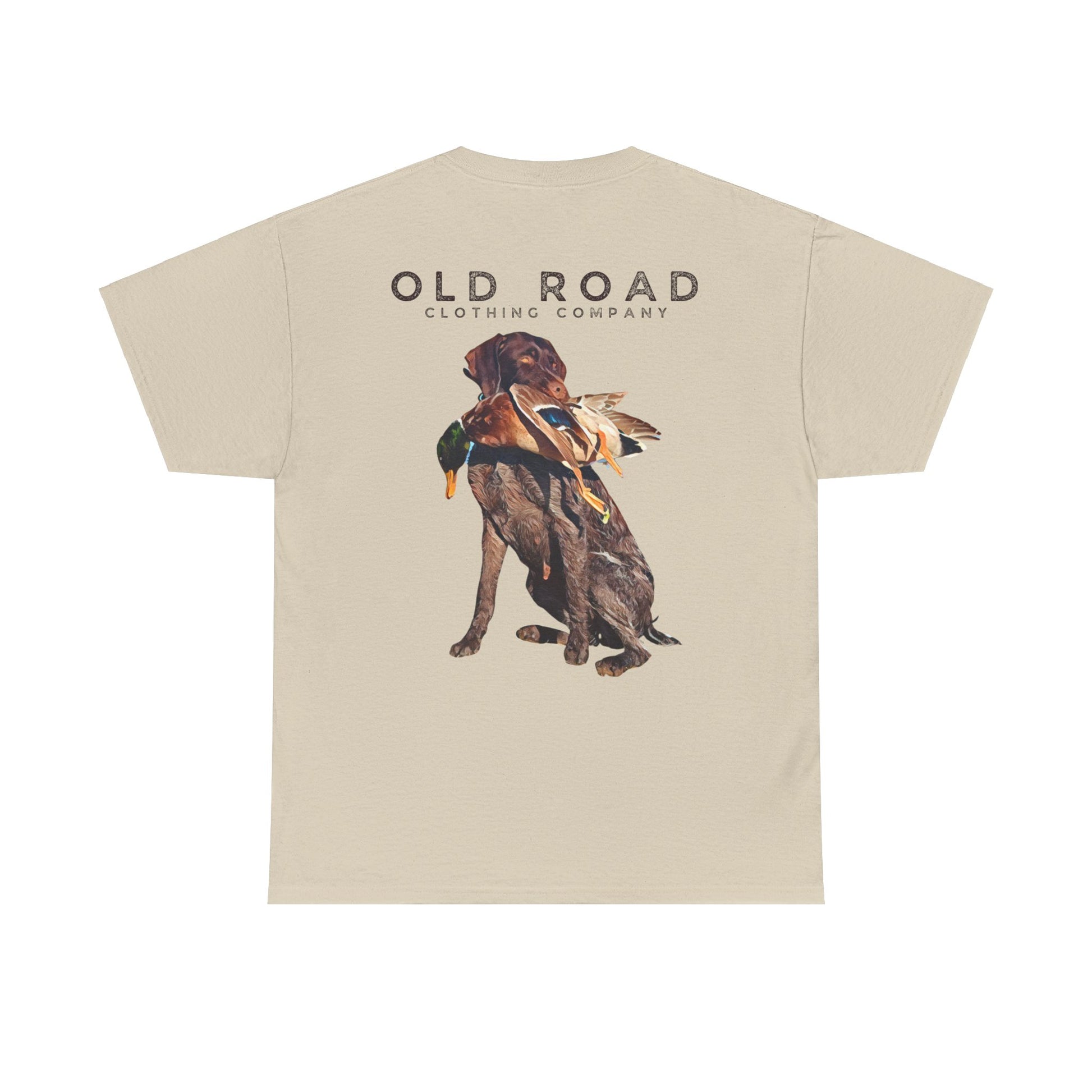 This shirt has our Old Road Clothing Company logo on the front and a German Wirehaird Pointer dog holding a duck in its mouth on the back.