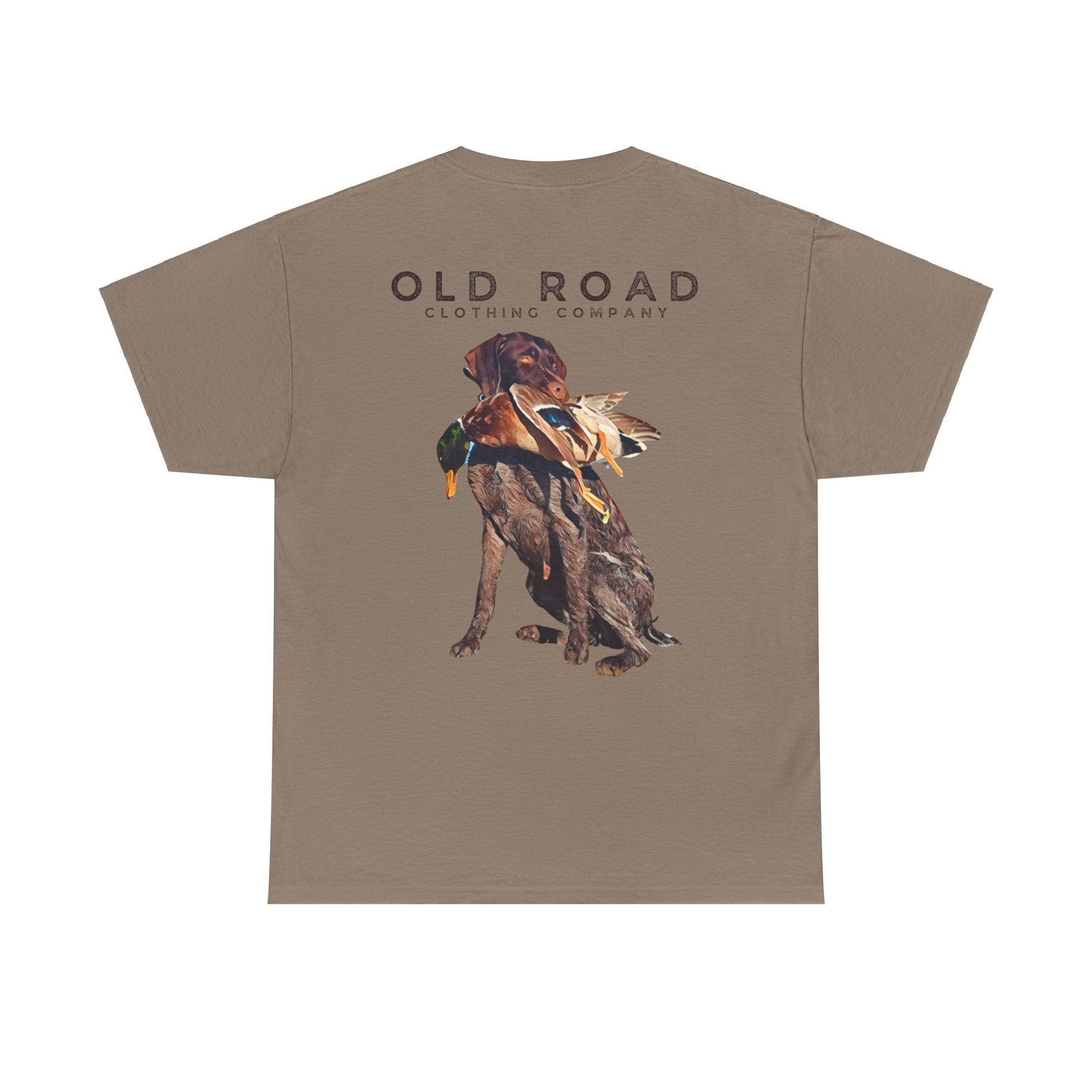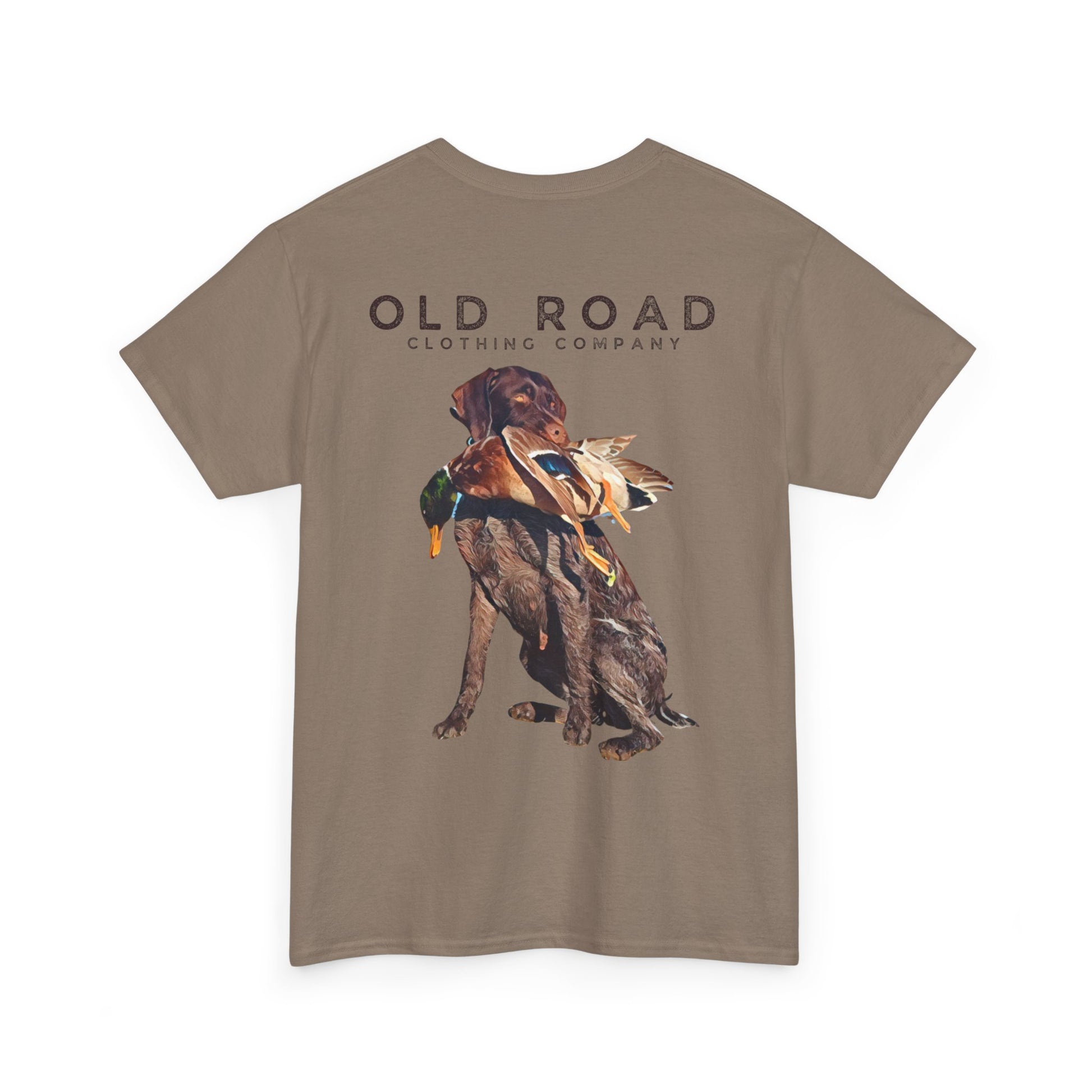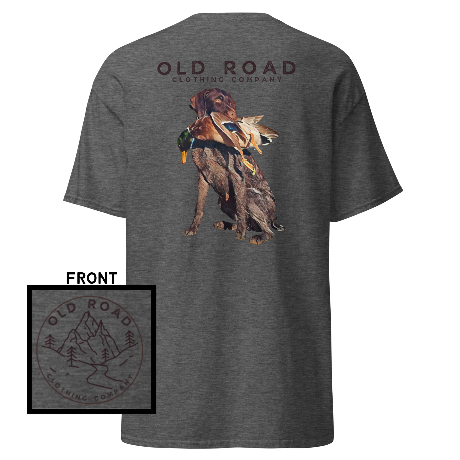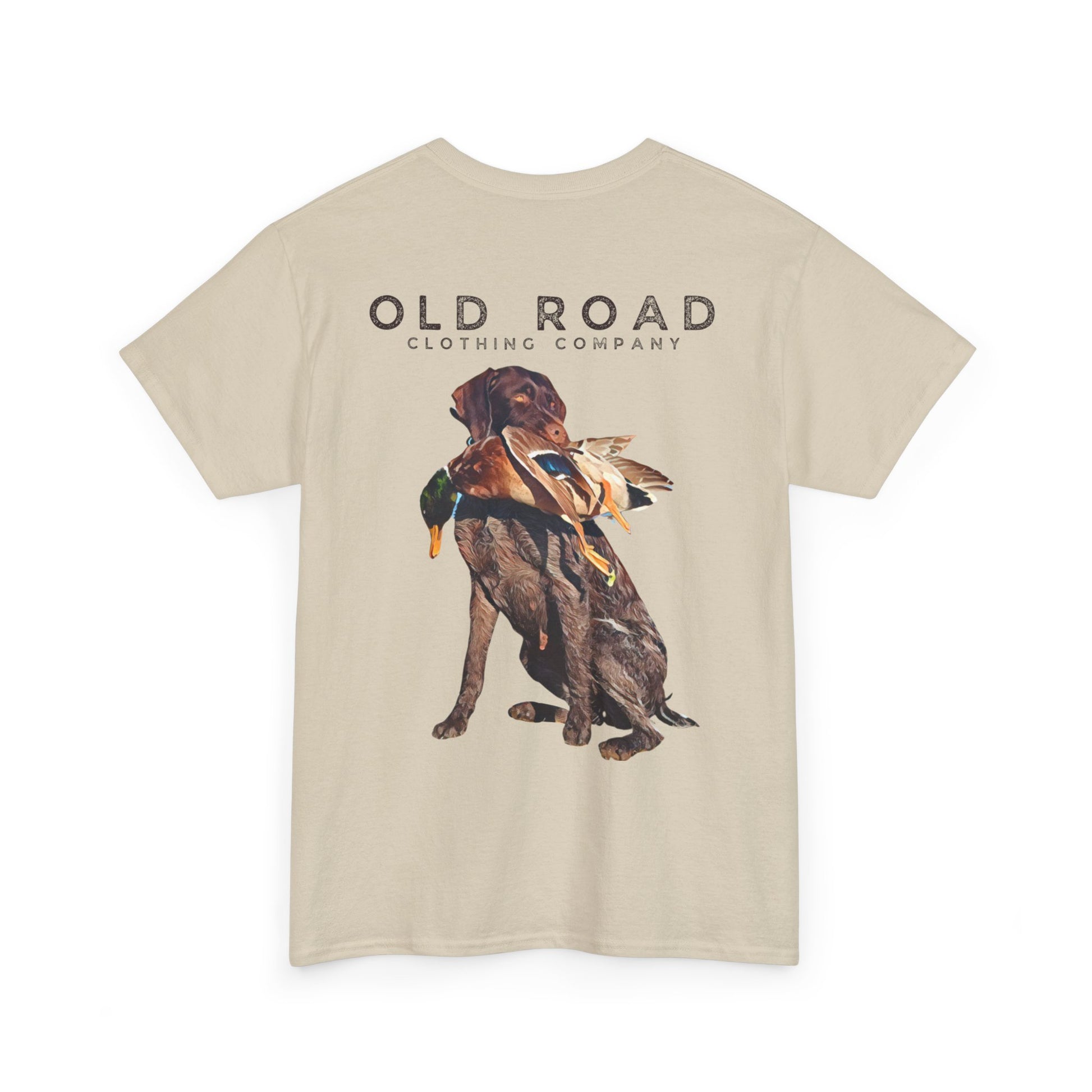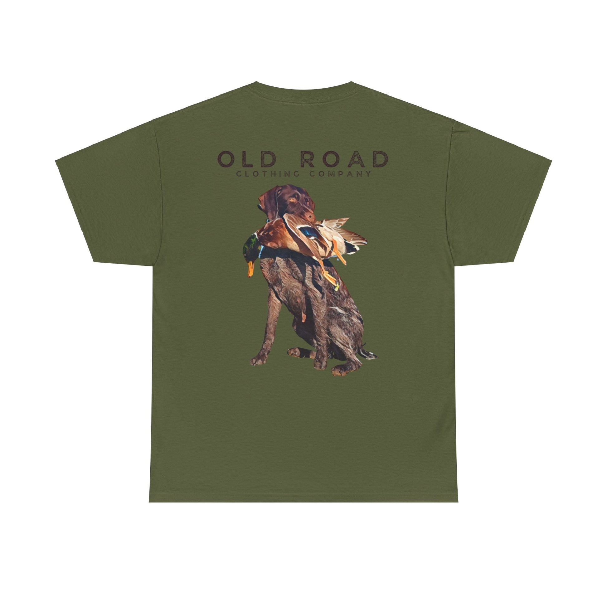 This shirt has our Old Road Clothing Company logo on the front and a German Wirehaird Pointer dog holding a duck in its mouth on the back.