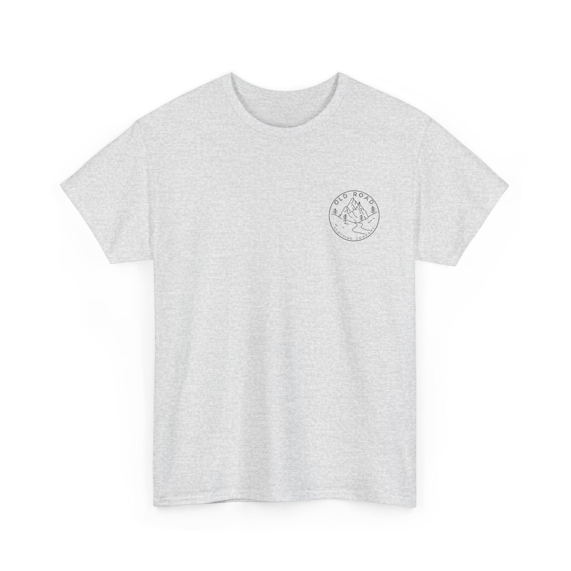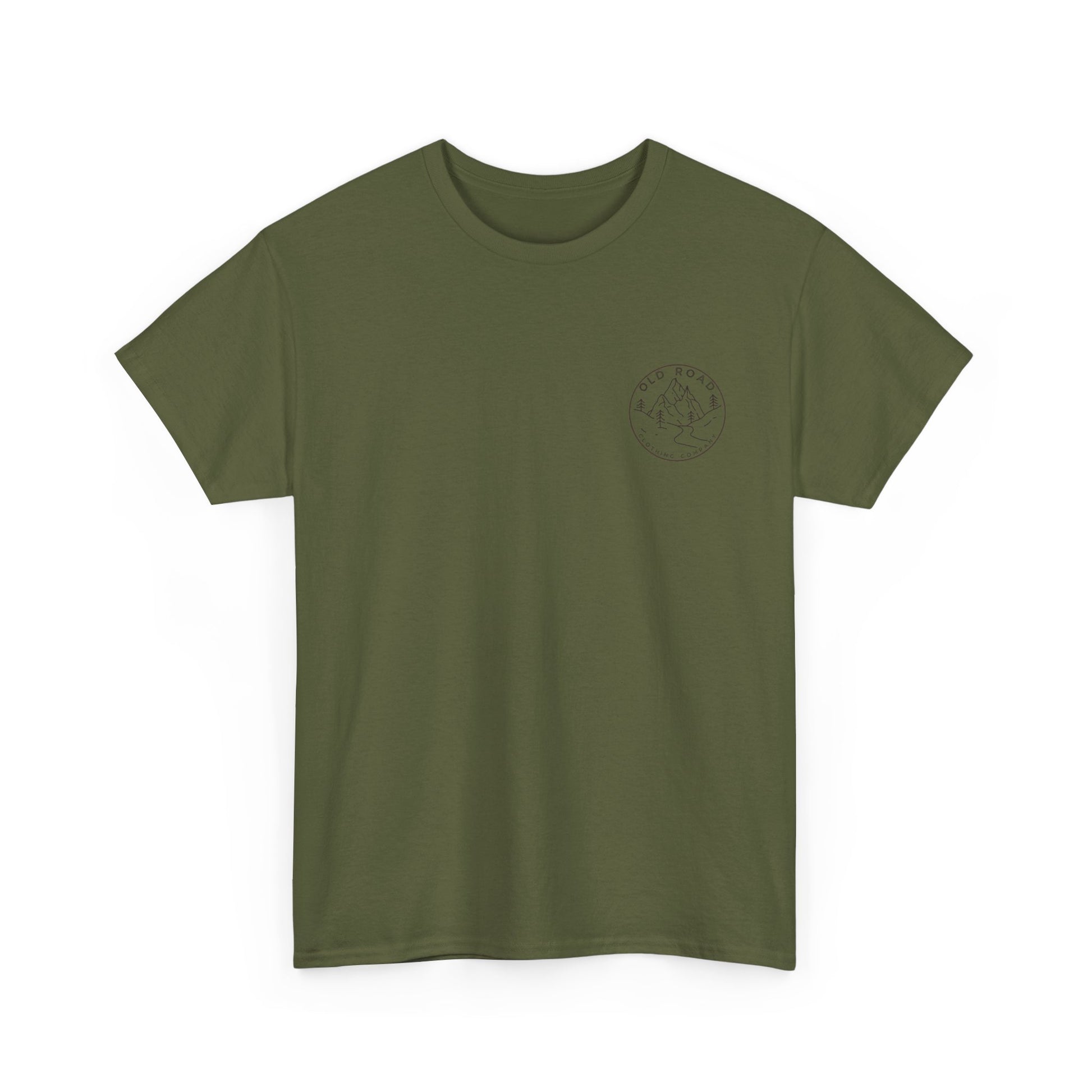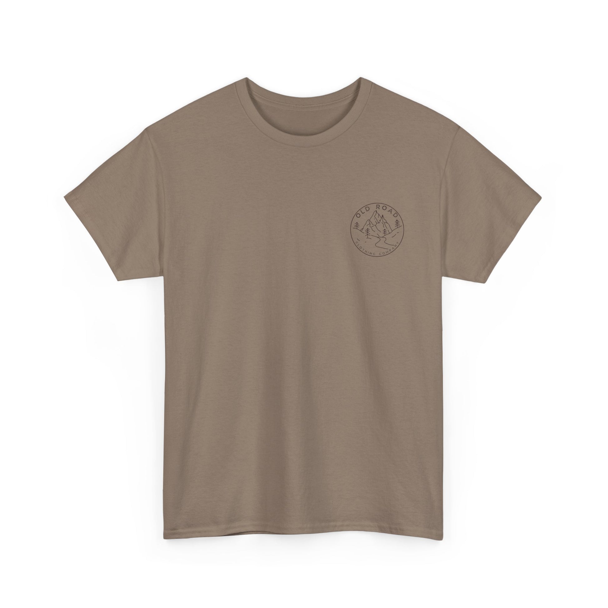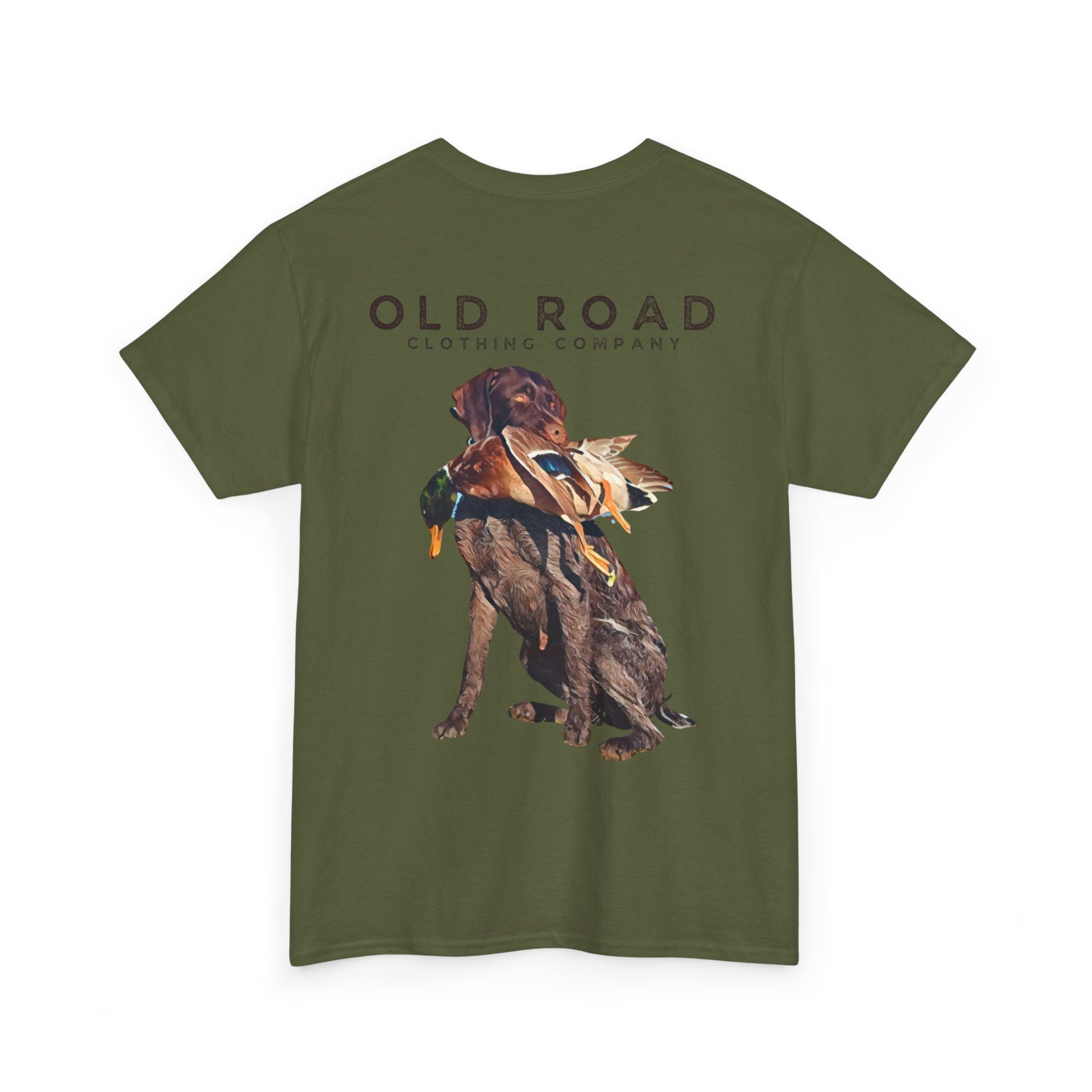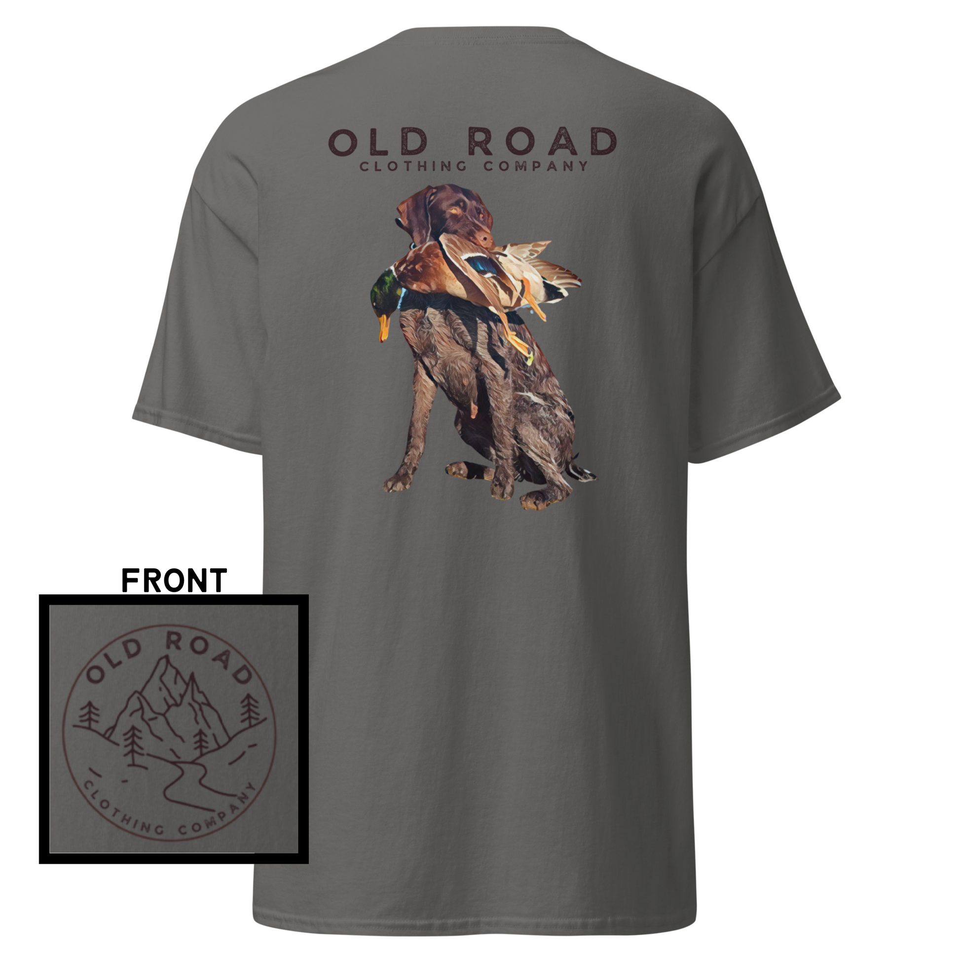 This shirt has our Old Road Clothing Company logo on the front and a German Wirehaird Pointer dog holding a duck in its mouth on the back.