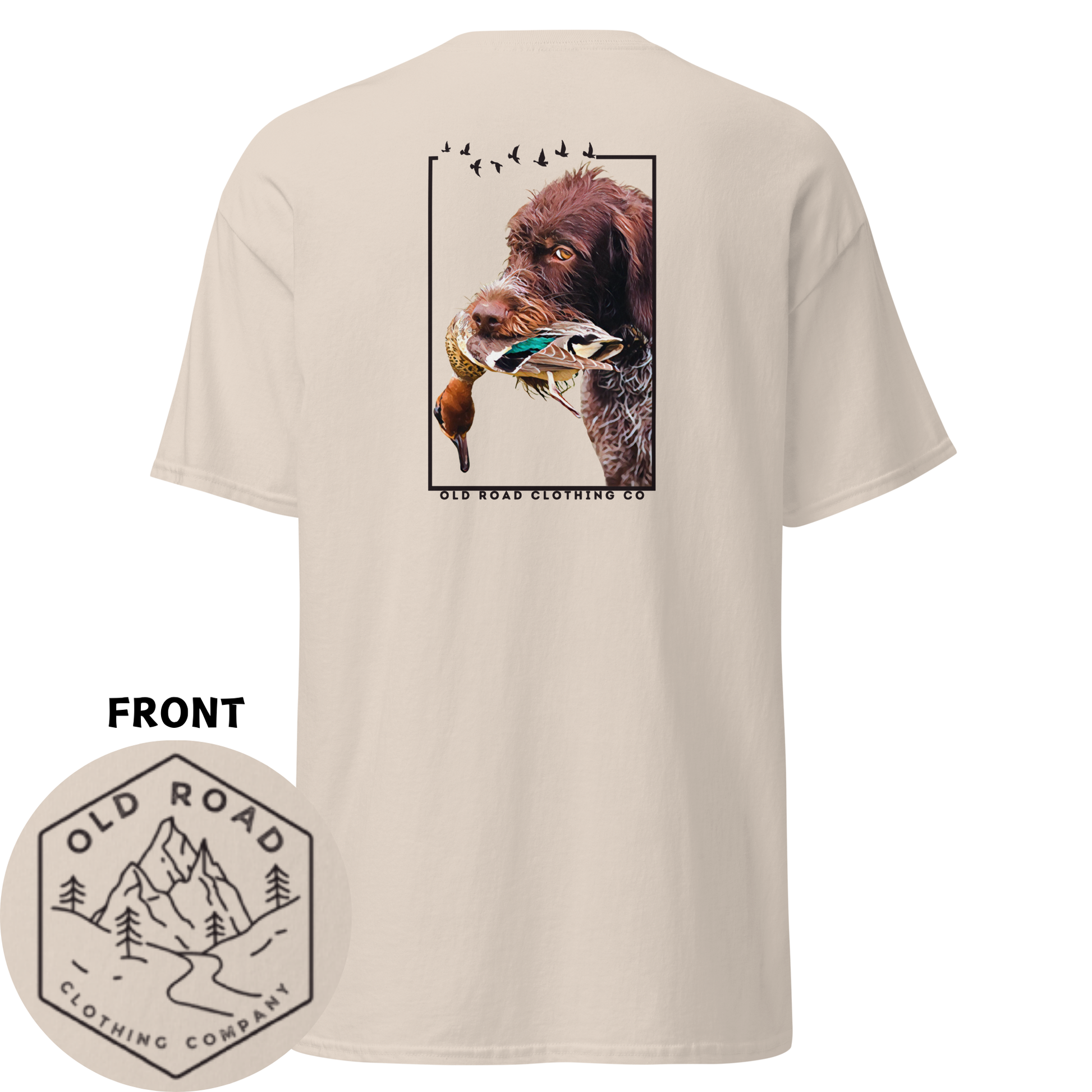 This is a Gildan heavy cotton t shirt with a German Wirehaired Pointer holding a duck printed on the back and our Old Road Clothing Company logo Printed on the front.