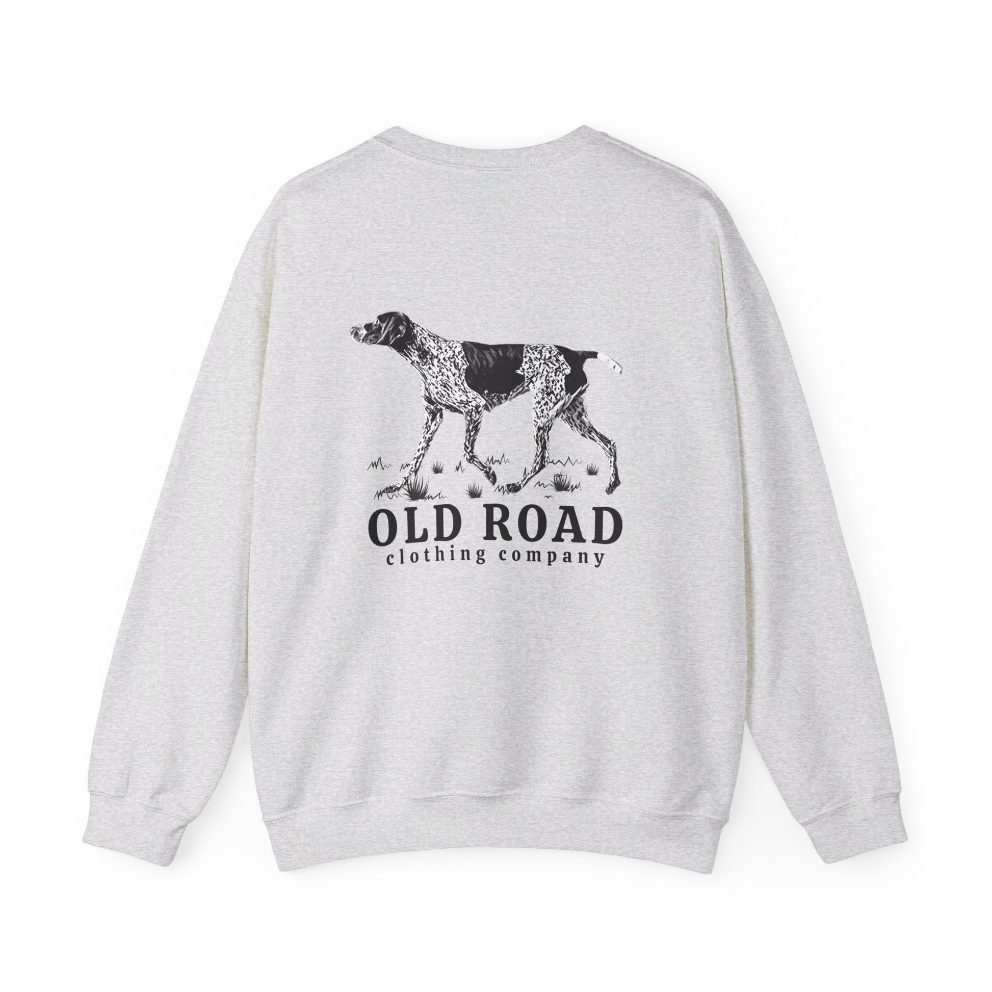This shirt has a GSP cross on the front of the shirt and on the back it has a black and white German Shorthaired Pointer Pointing on the back with our Old Road Clothing Company logo written underneath.