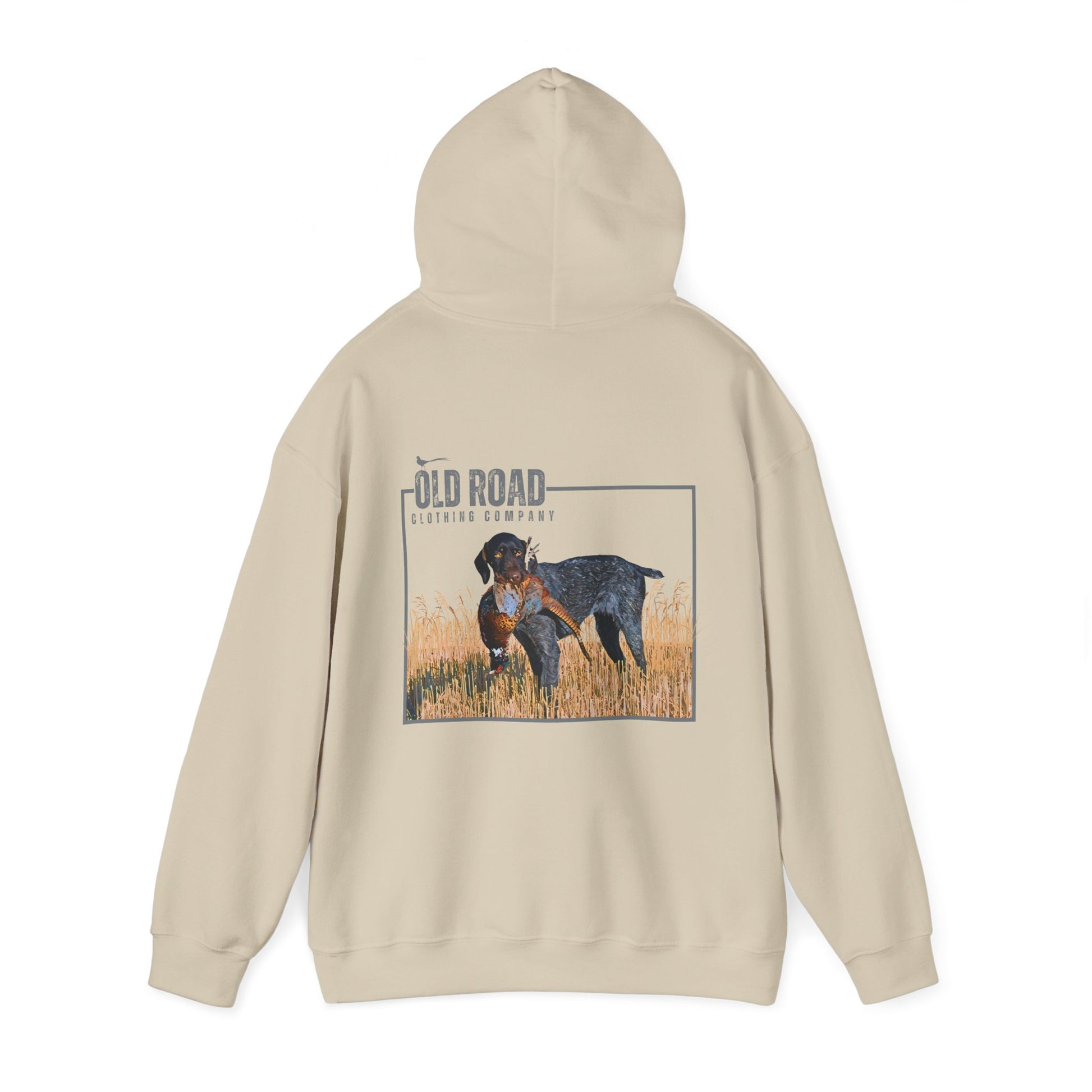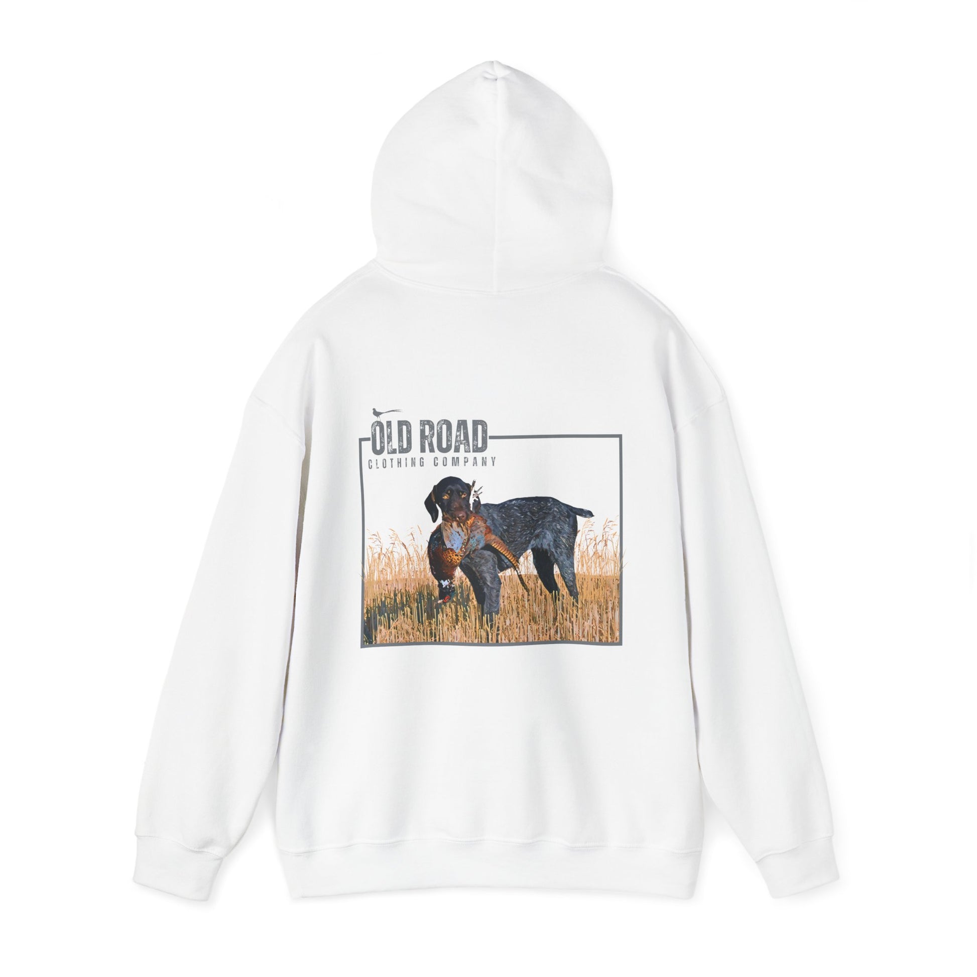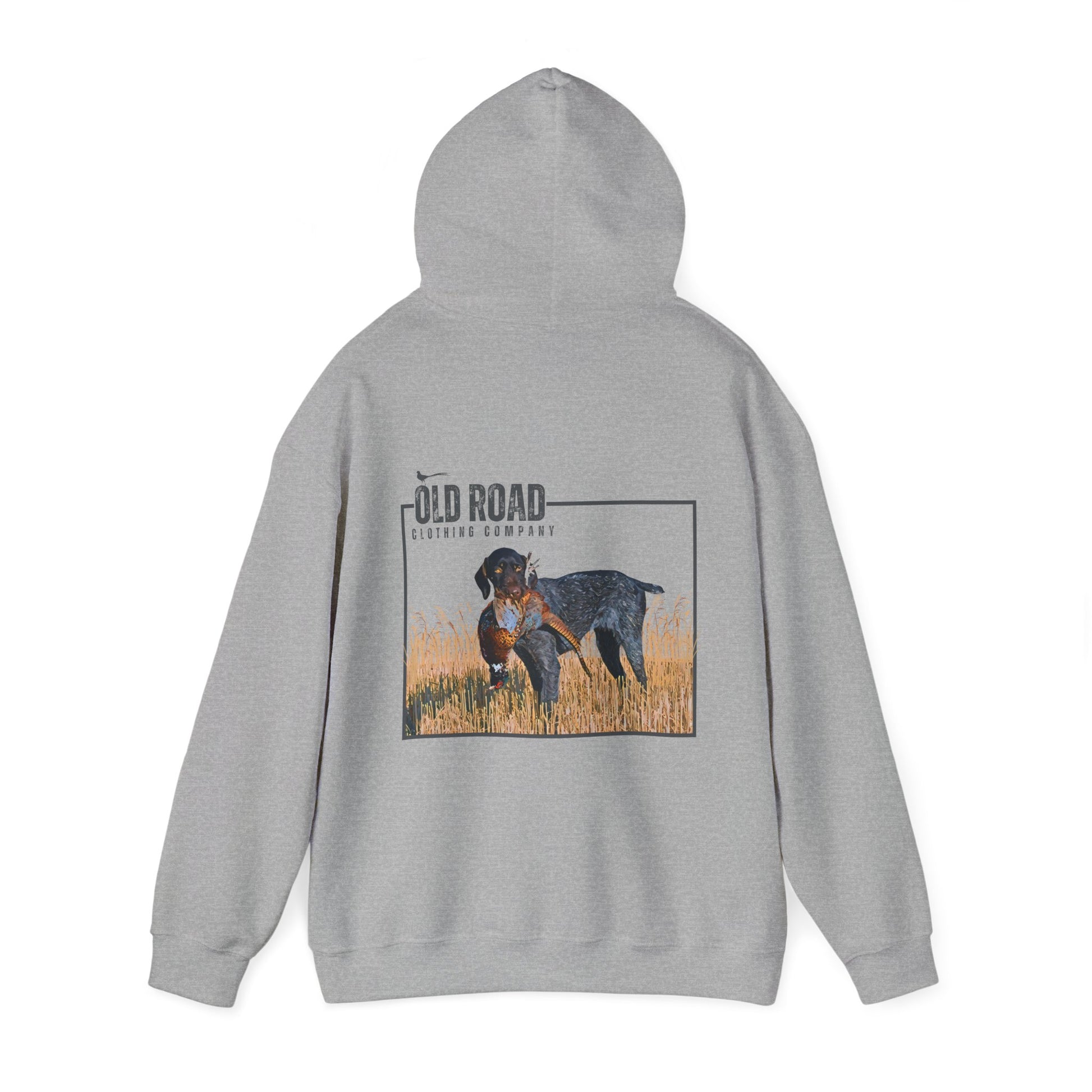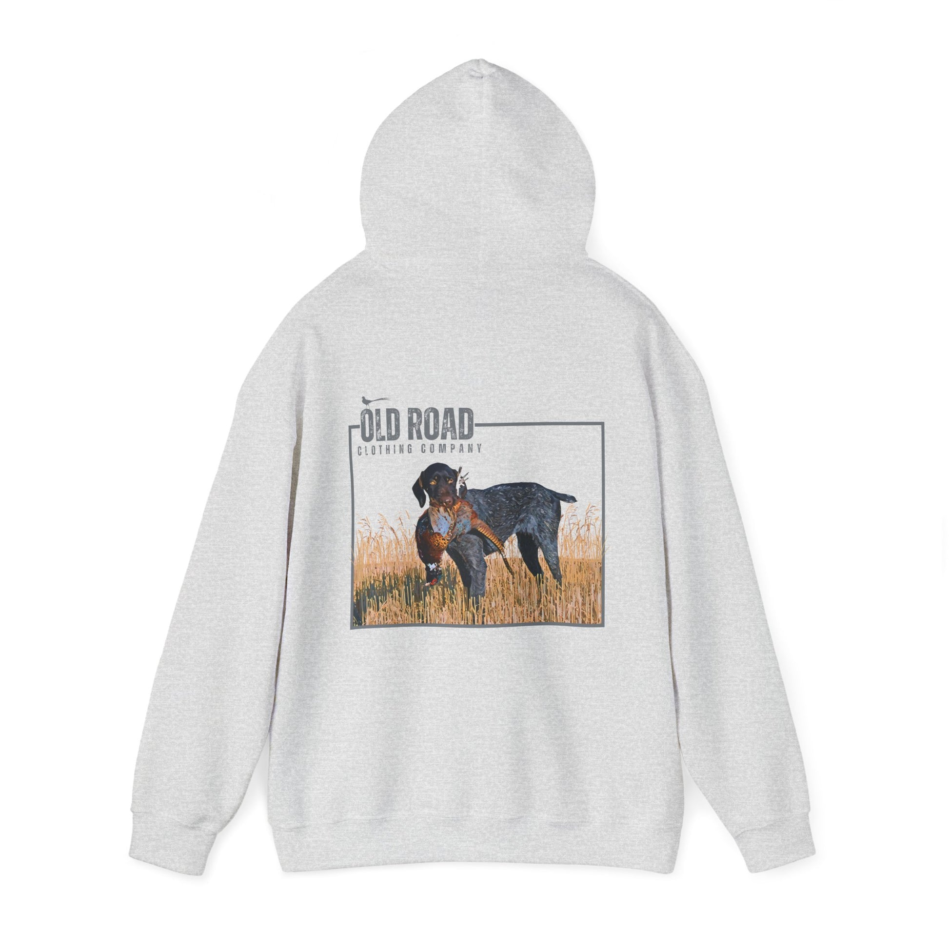 This Old Road Clothing Company hoodie has our logo on the front and a German Shorthaired Pointer holding a pheasant in its mouth. This is a custom design by our team. It's perfect for every pheasant or bird hunter.