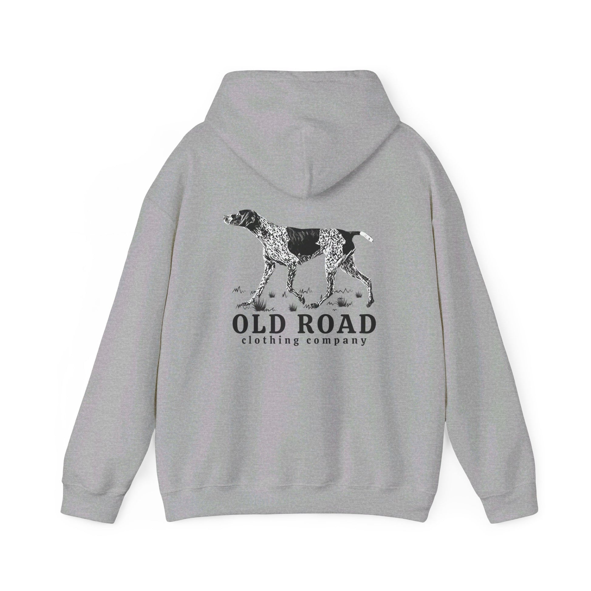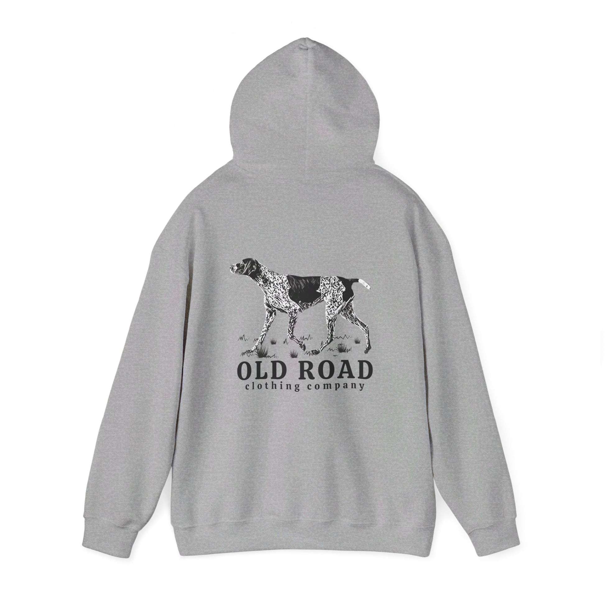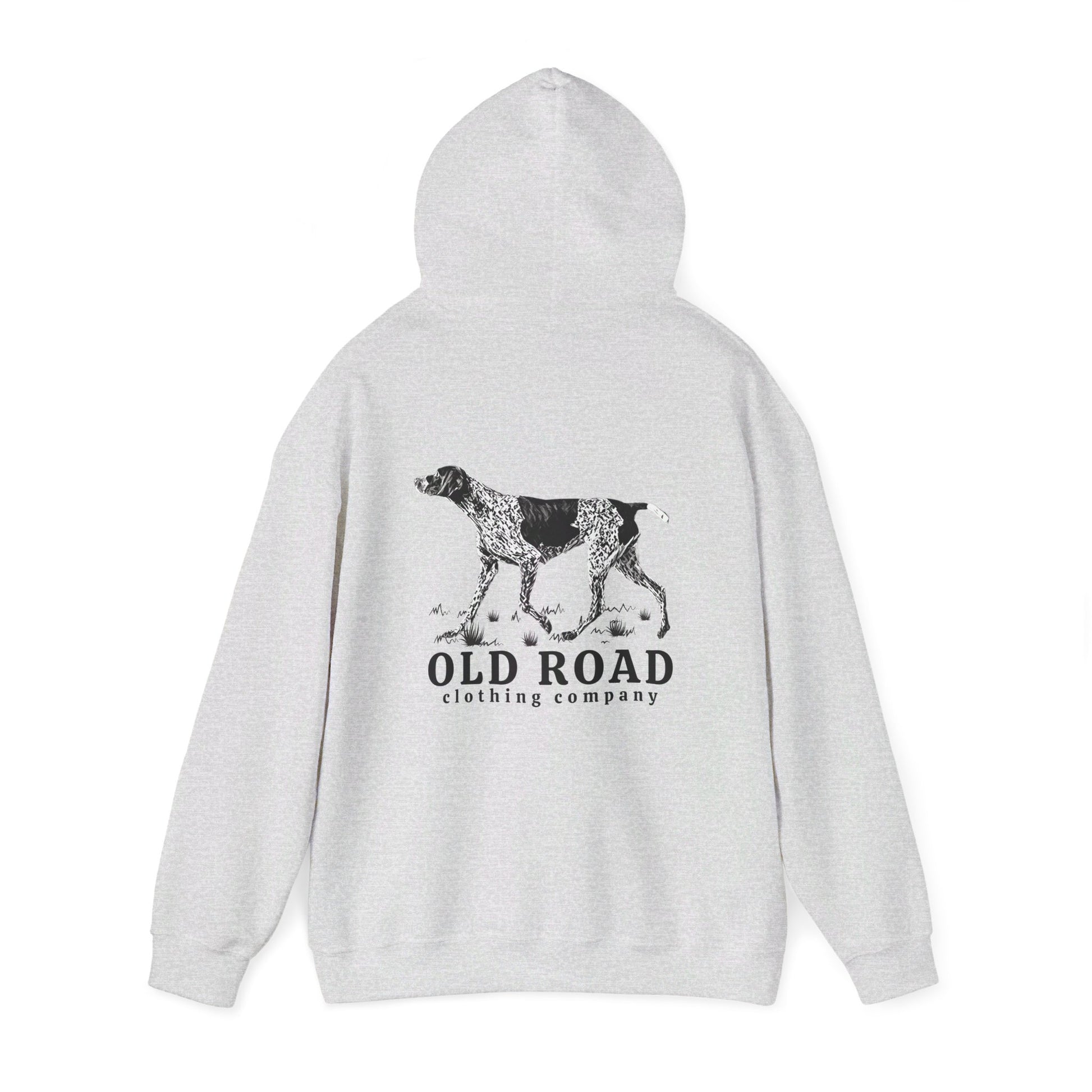 This shirt has a GSP cross on the front of the shirt and on the back it has a black and white German Shorthaired Pointer Pointing on the back with our Old Road Clothing Company logo written underneath.