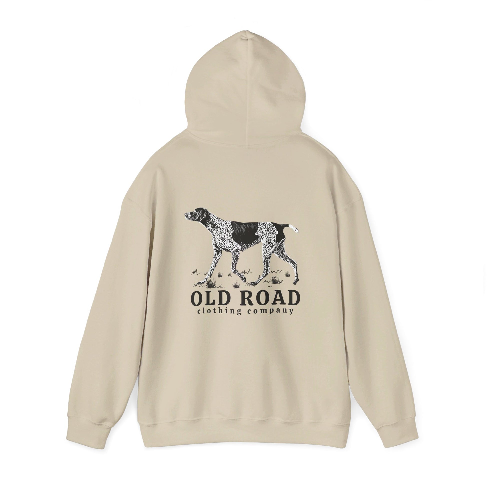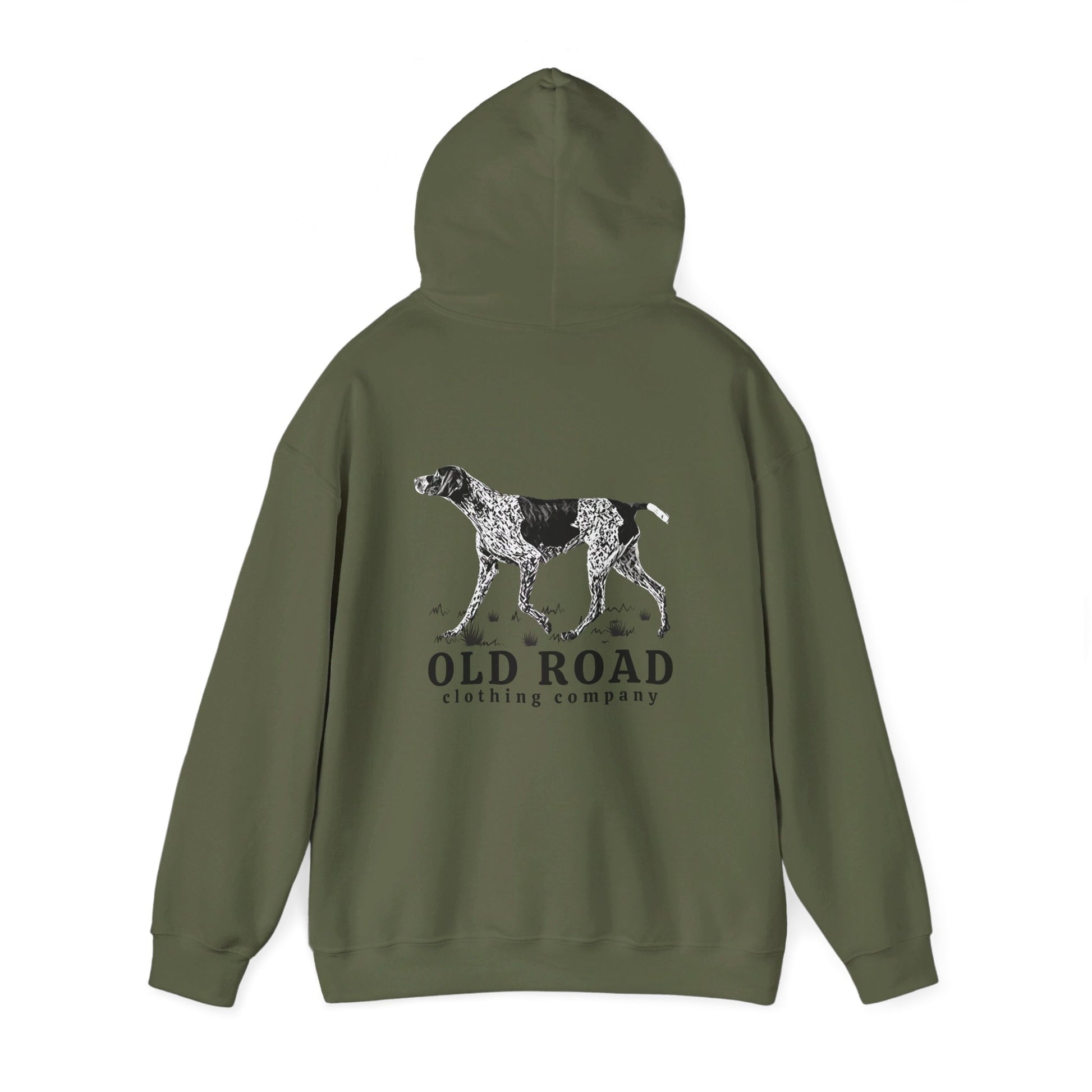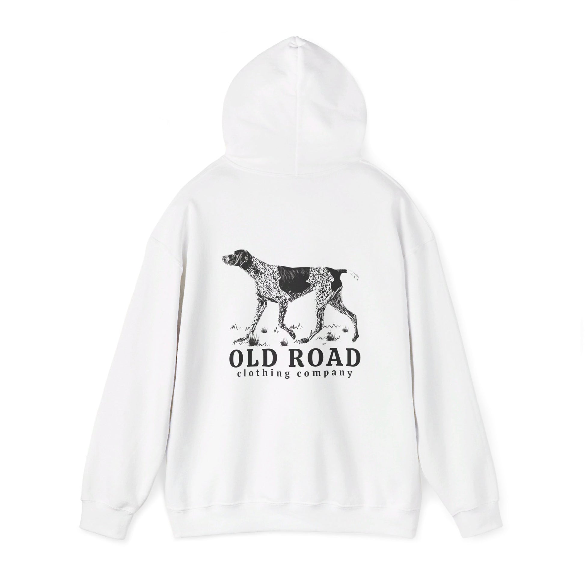 This shirt has a GSP cross on the front of the shirt and on the back it has a black and white German Shorthaired Pointer Pointing on the back with our Old Road Clothing Company logo written underneath.