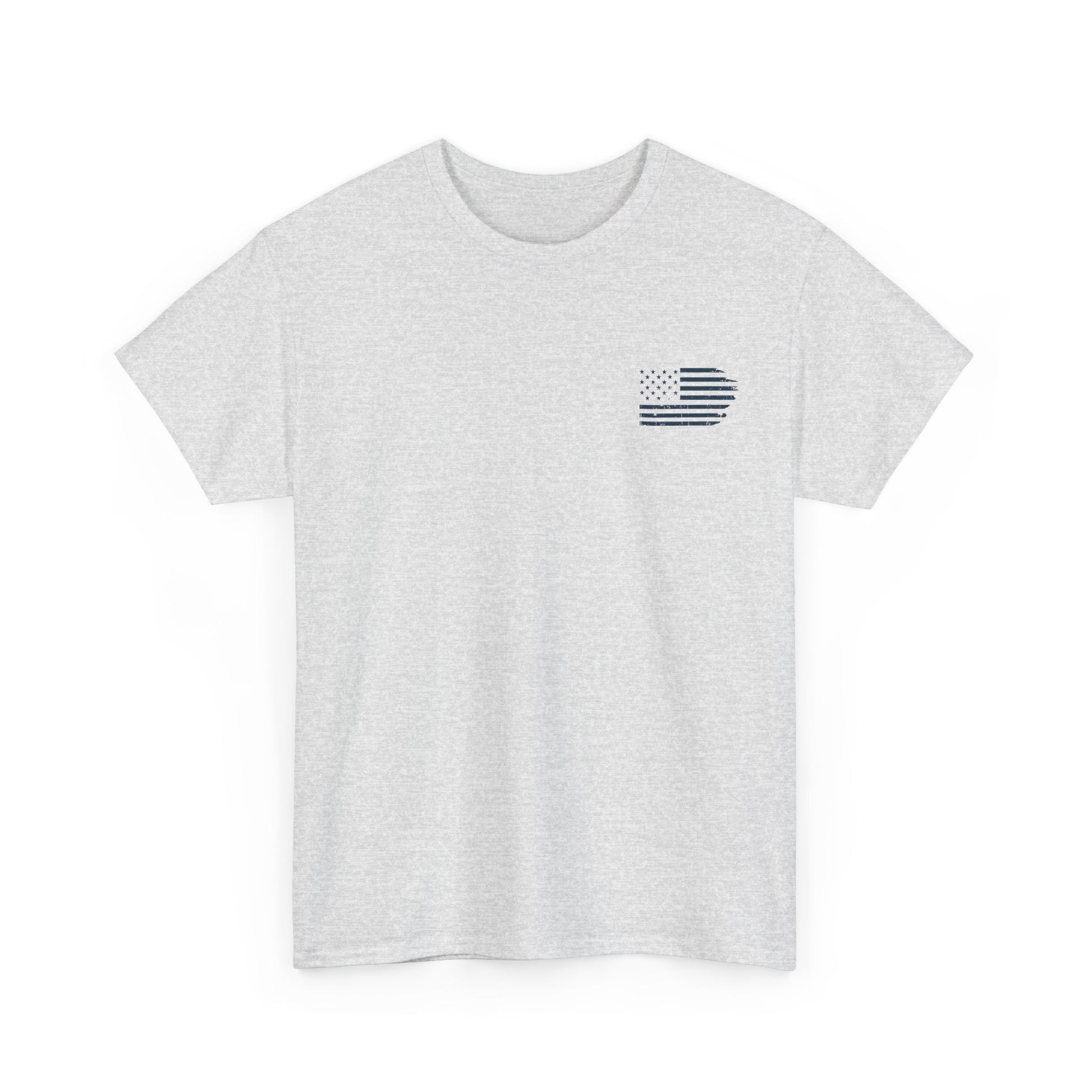 This shirt has a GSP in front of an American Flag on the back and an American Flag on the front left chest