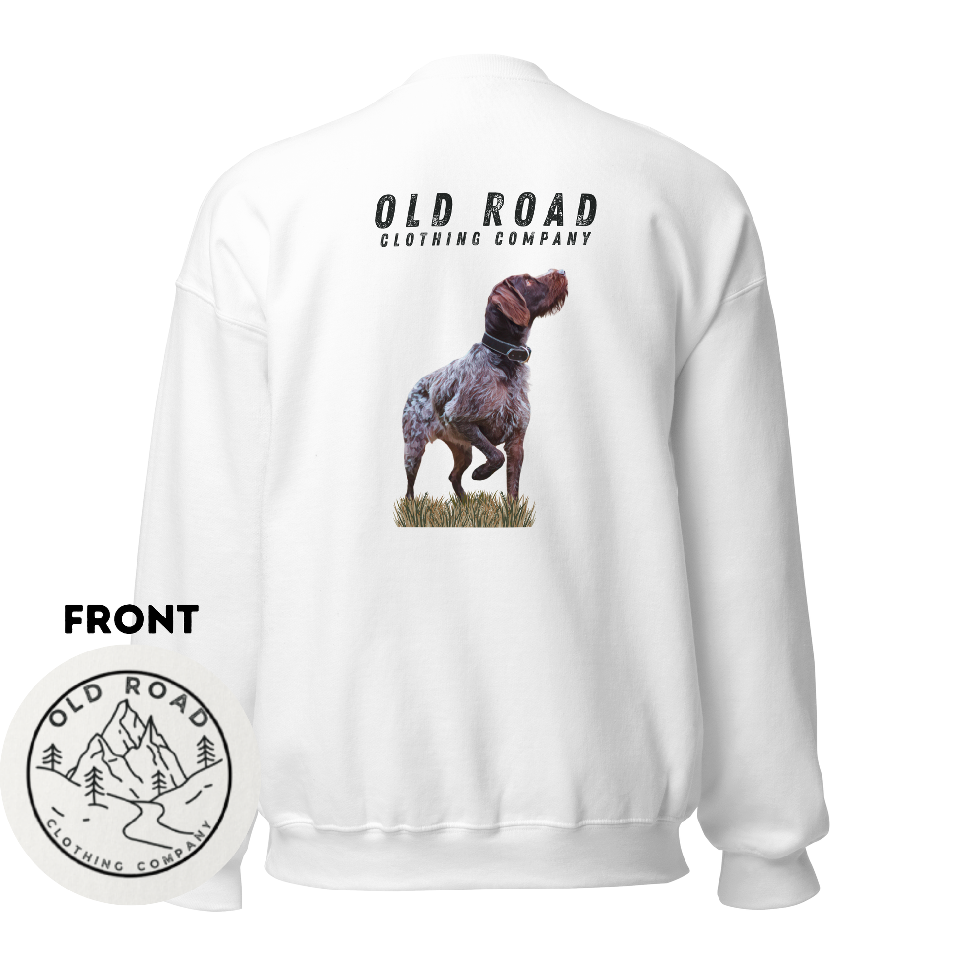 This crewneck sweatshirt is unisex fit, please review size chart, consider sizing up. This crewneck has a German Wirehaired Pointer pointing on the front and our Old Road Clothing Company logo on the front. **Unisex Fit- Please review size chart before purchasing as we do not accept returns. If there is an issue with our order please reach out to us.