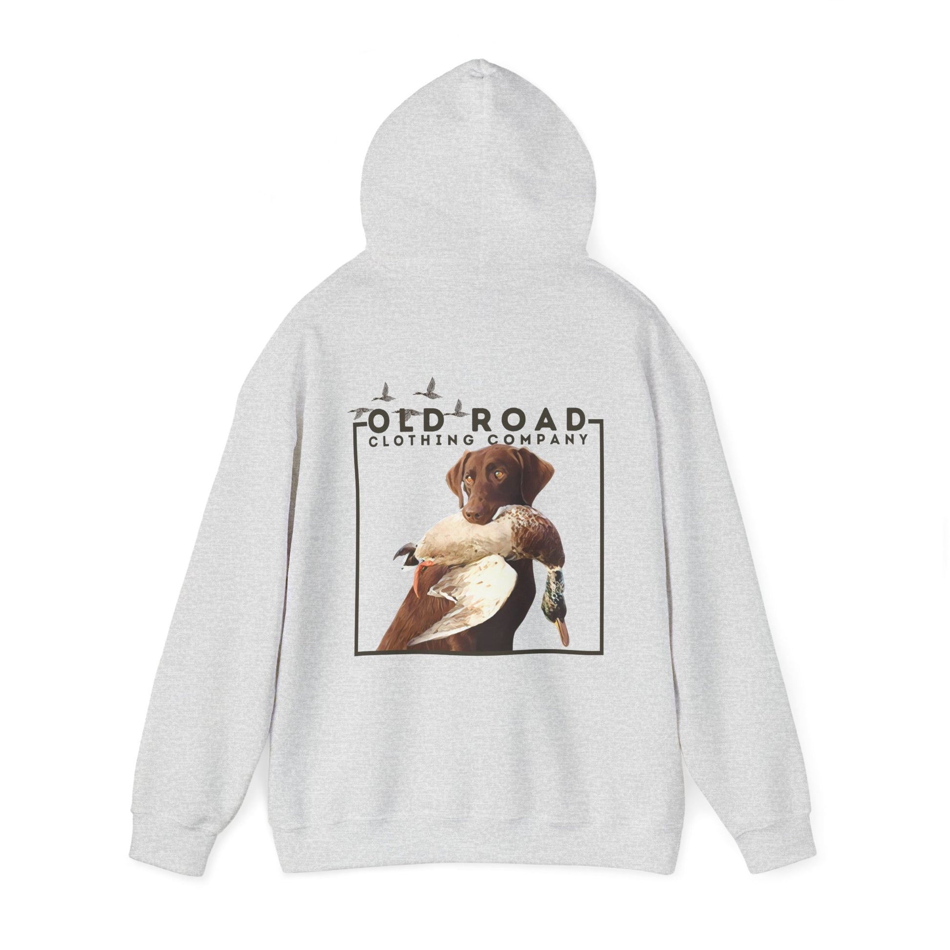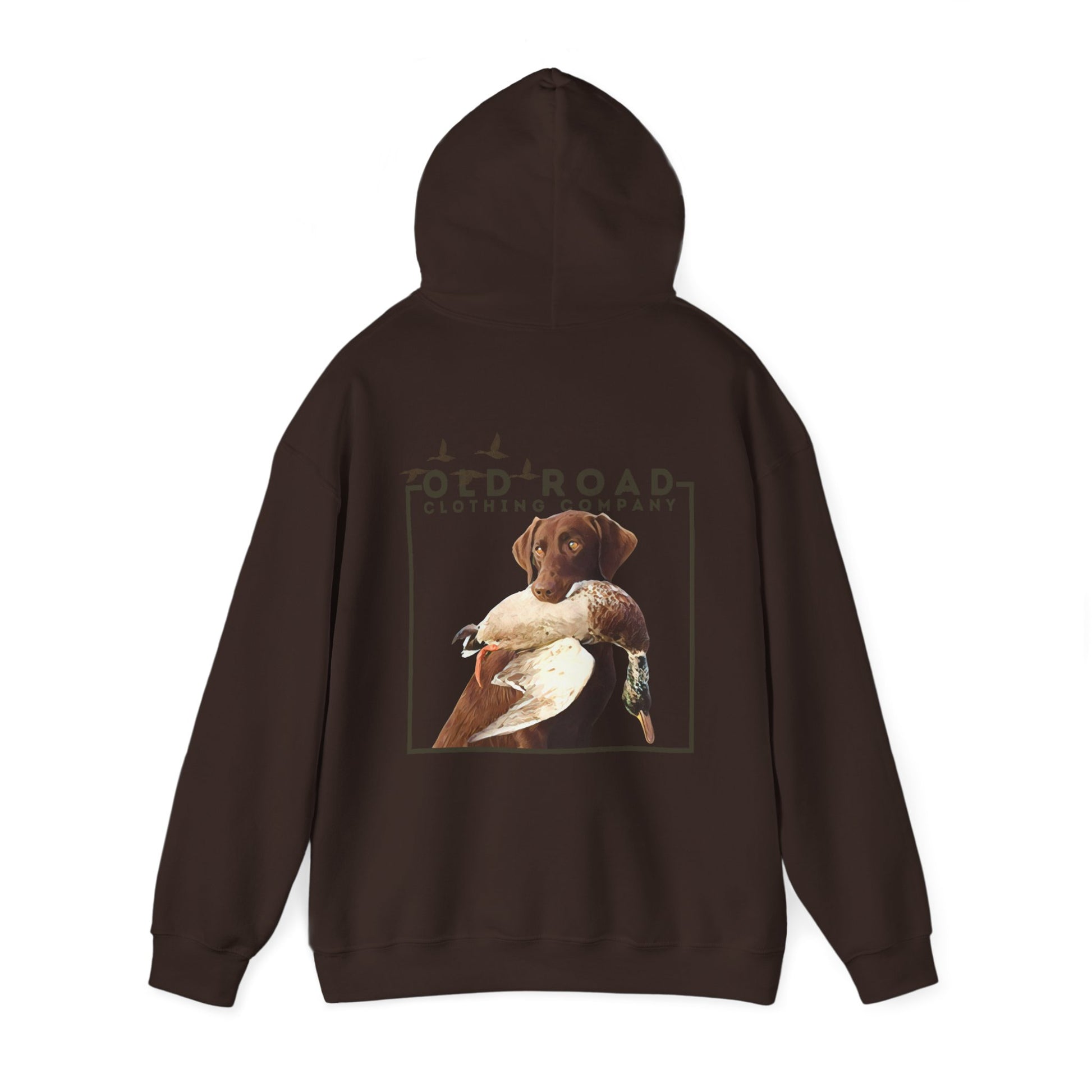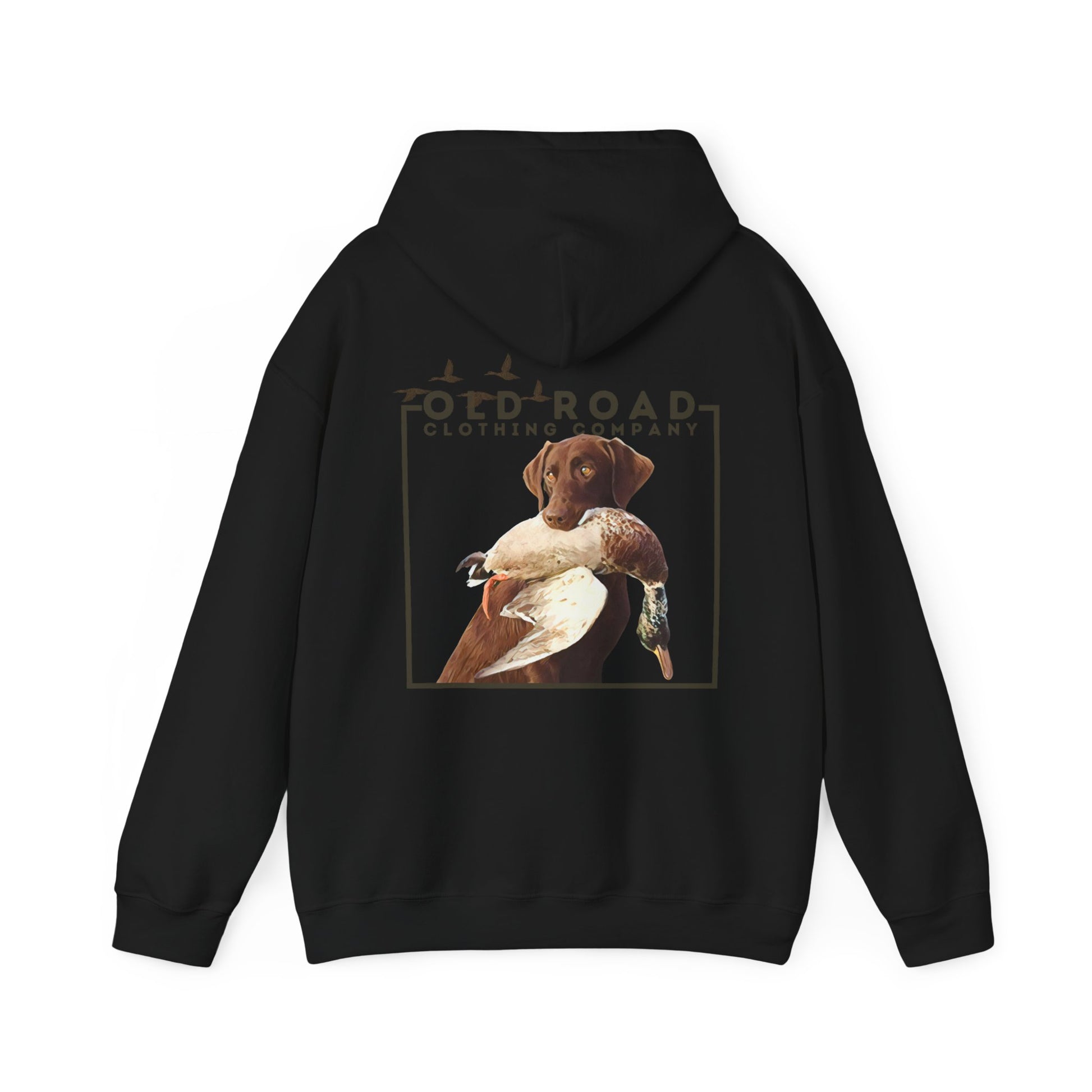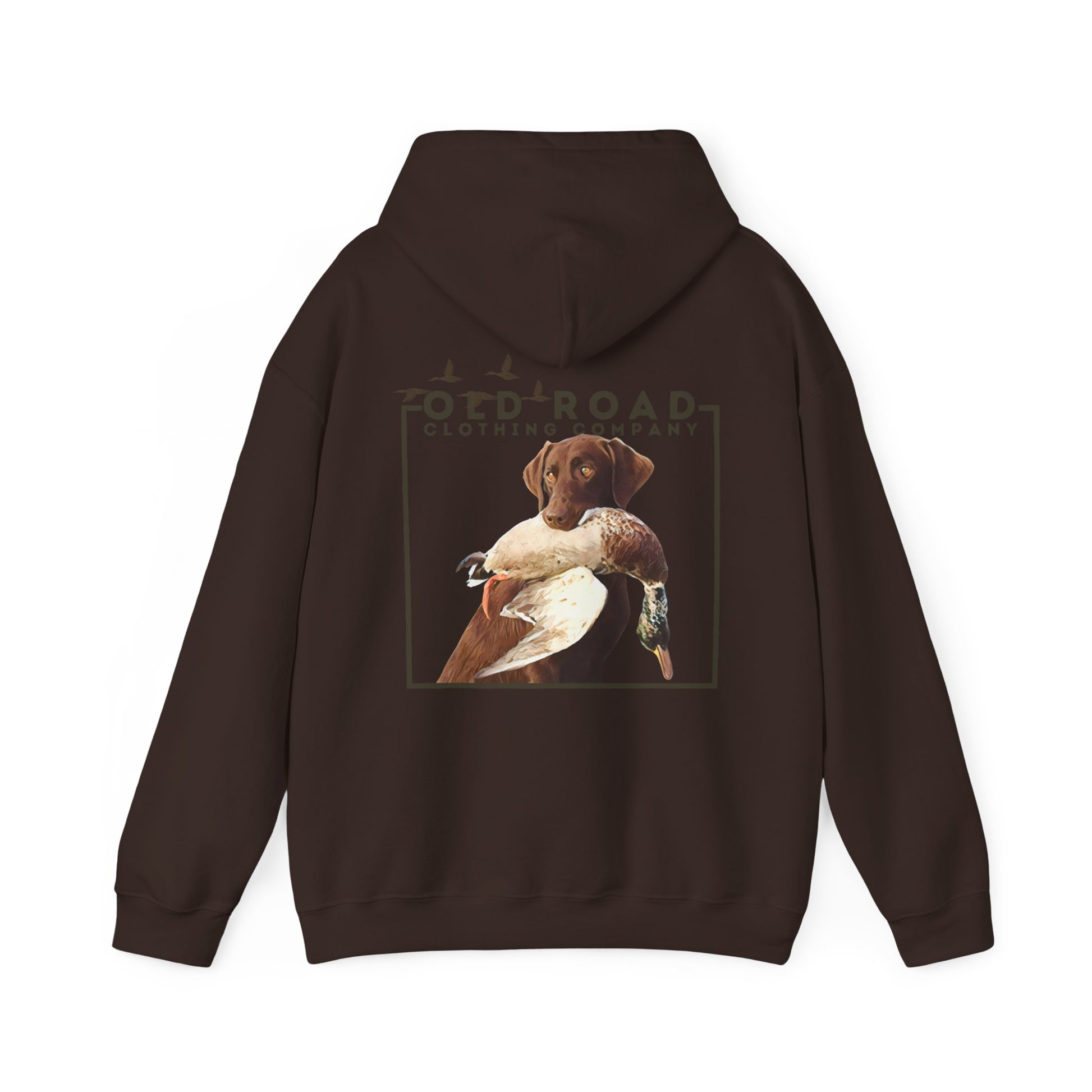 This hoodie has our Old Road Clothing Company logo on the front of the hoodie and on the back of the hoodie there is a chocolate Labrador Retriever holding a duck in its mouth. This would be a perfect gift for a duck hunter or a Labrador lover!