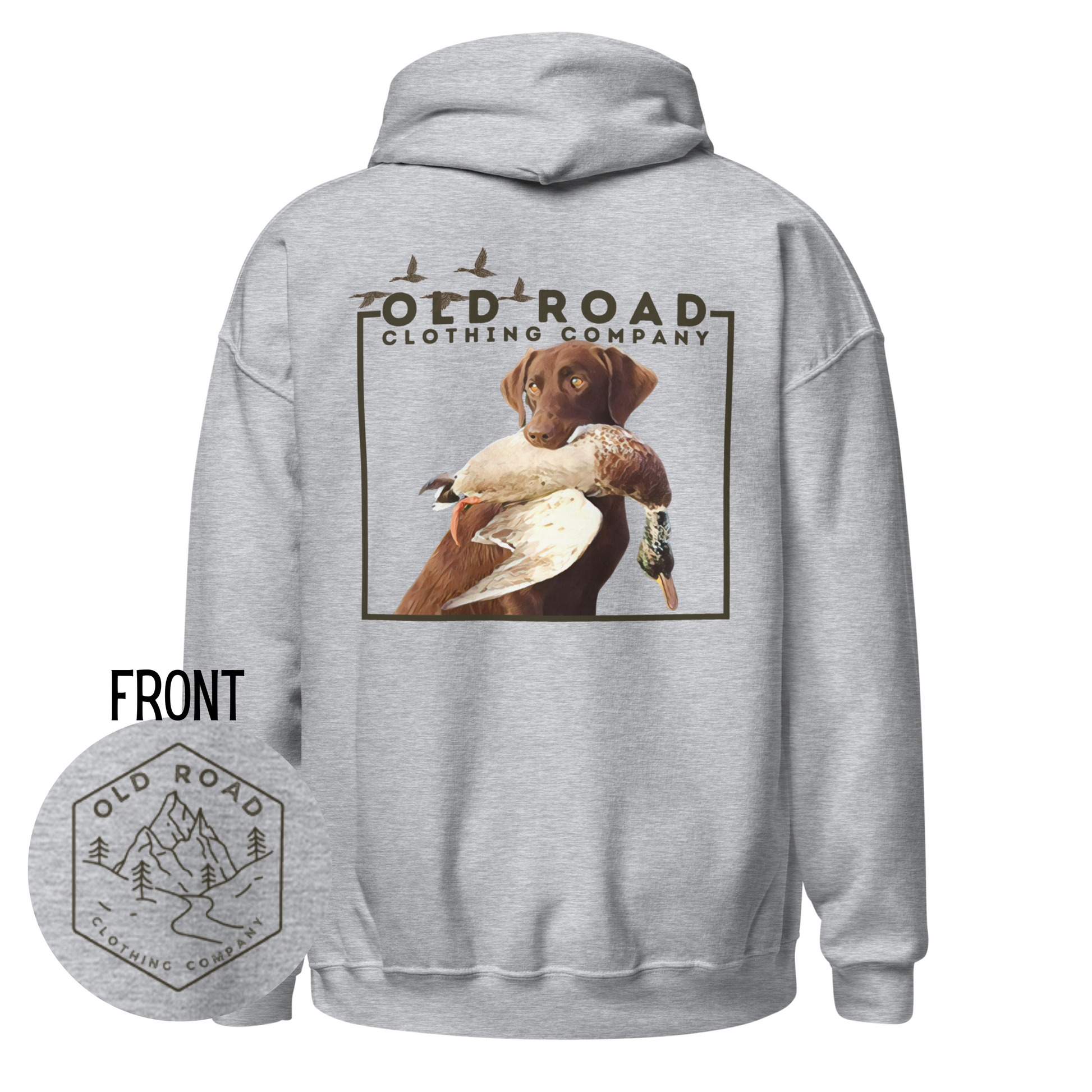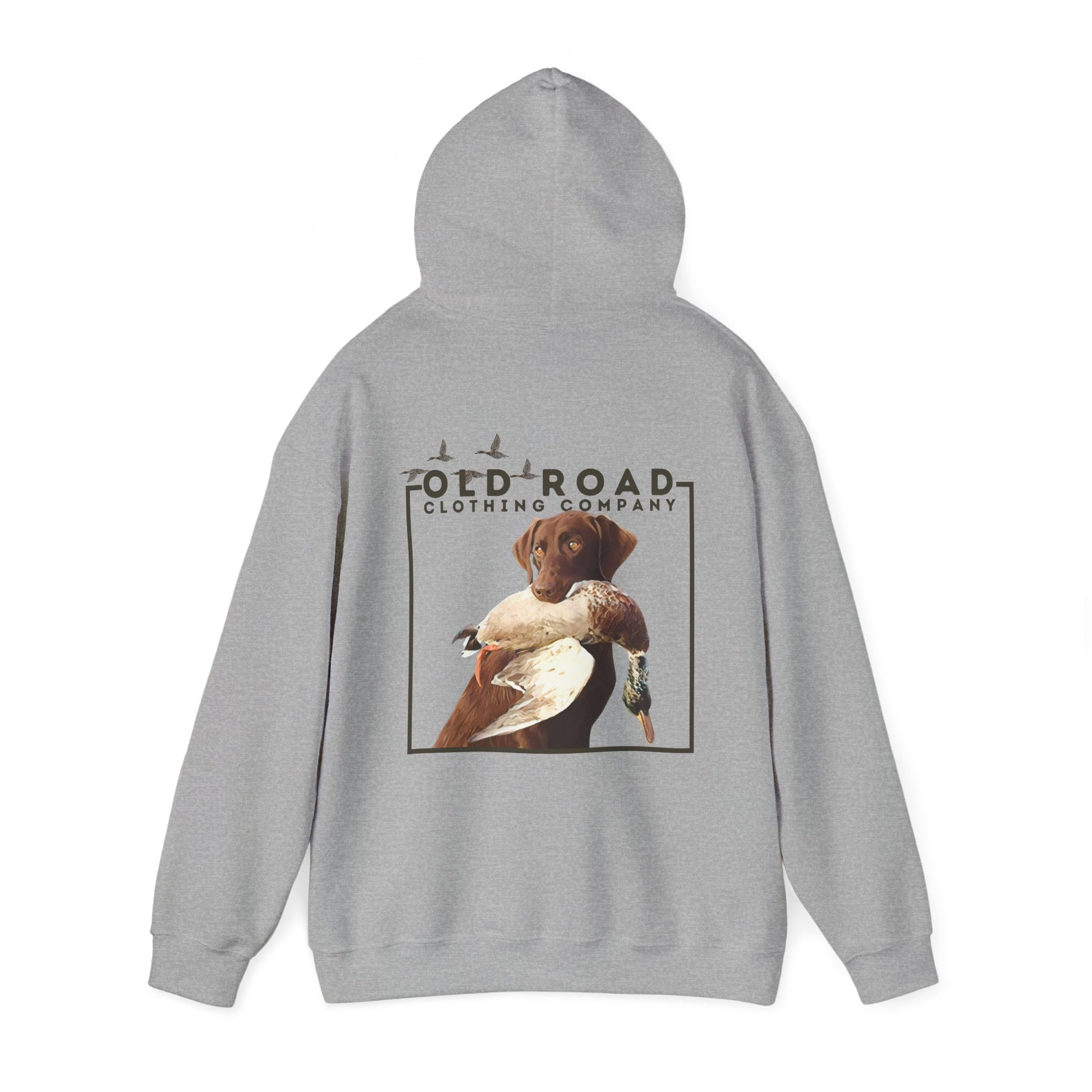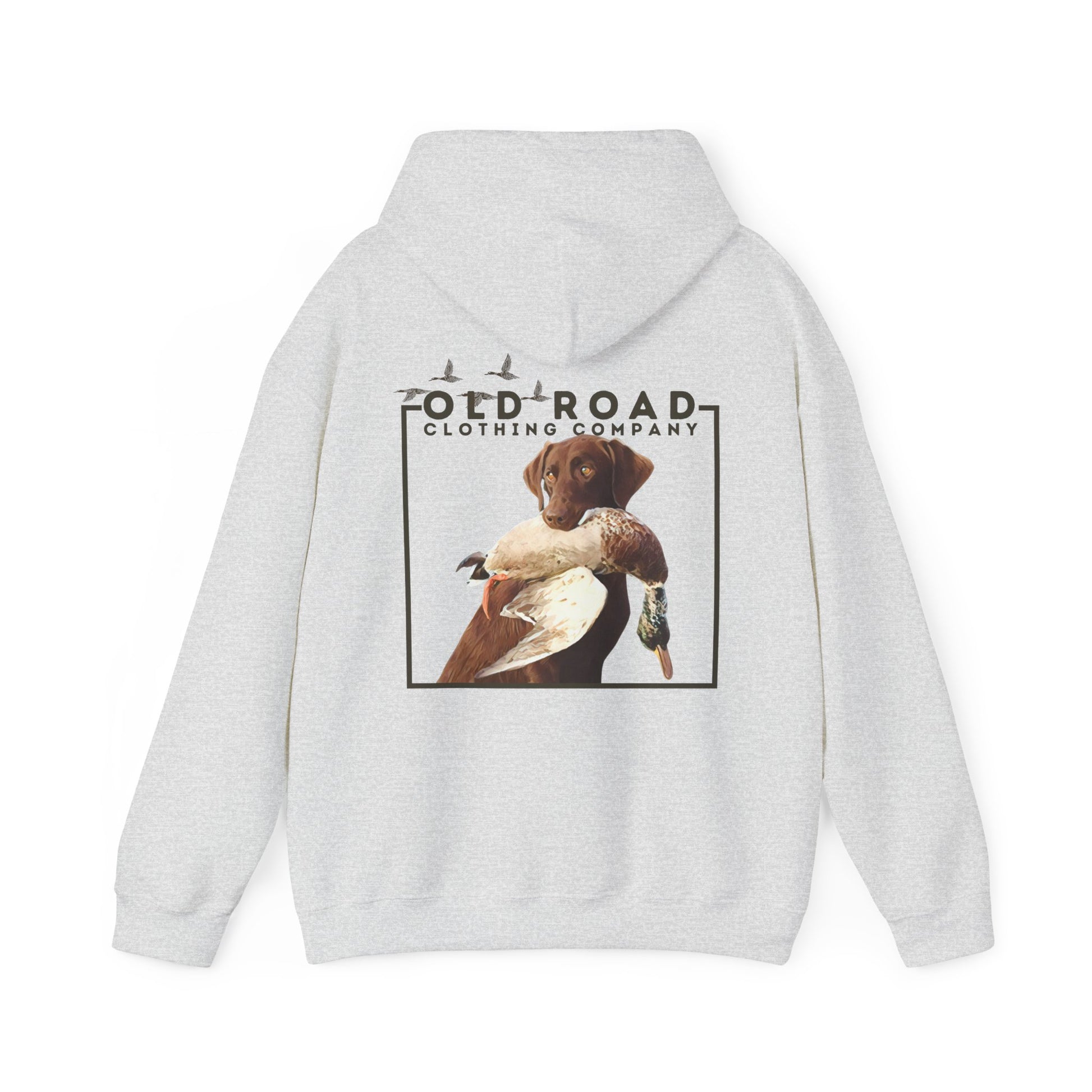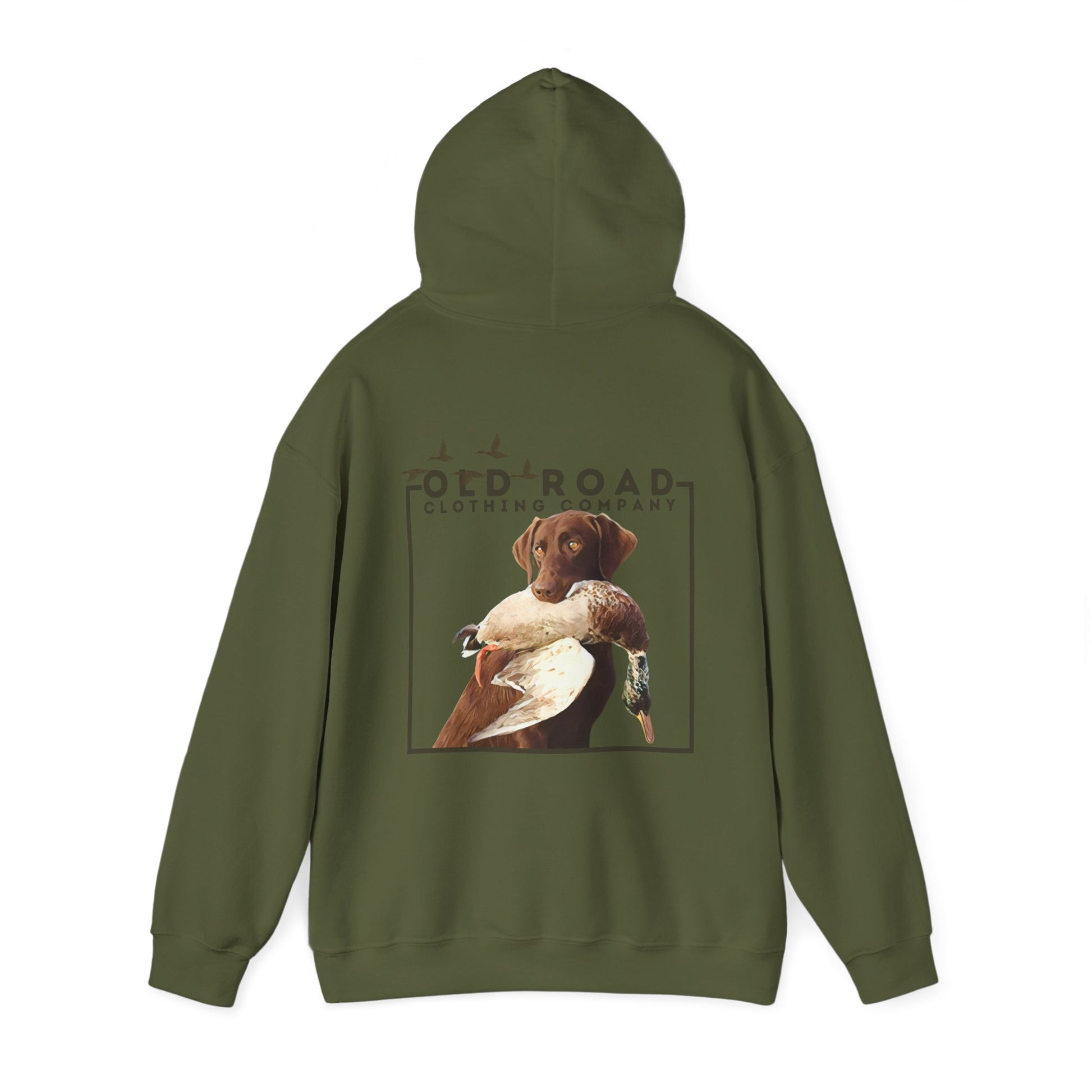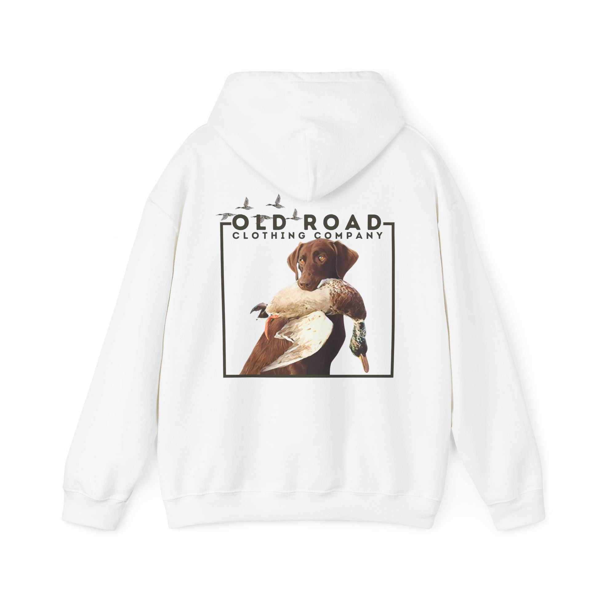 This hoodie has our Old Road Clothing Company logo on the front of the hoodie and on the back of the hoodie there is a chocolate Labrador Retriever holding a duck in its mouth. This would be a perfect gift for a duck hunter or a Labrador lover!