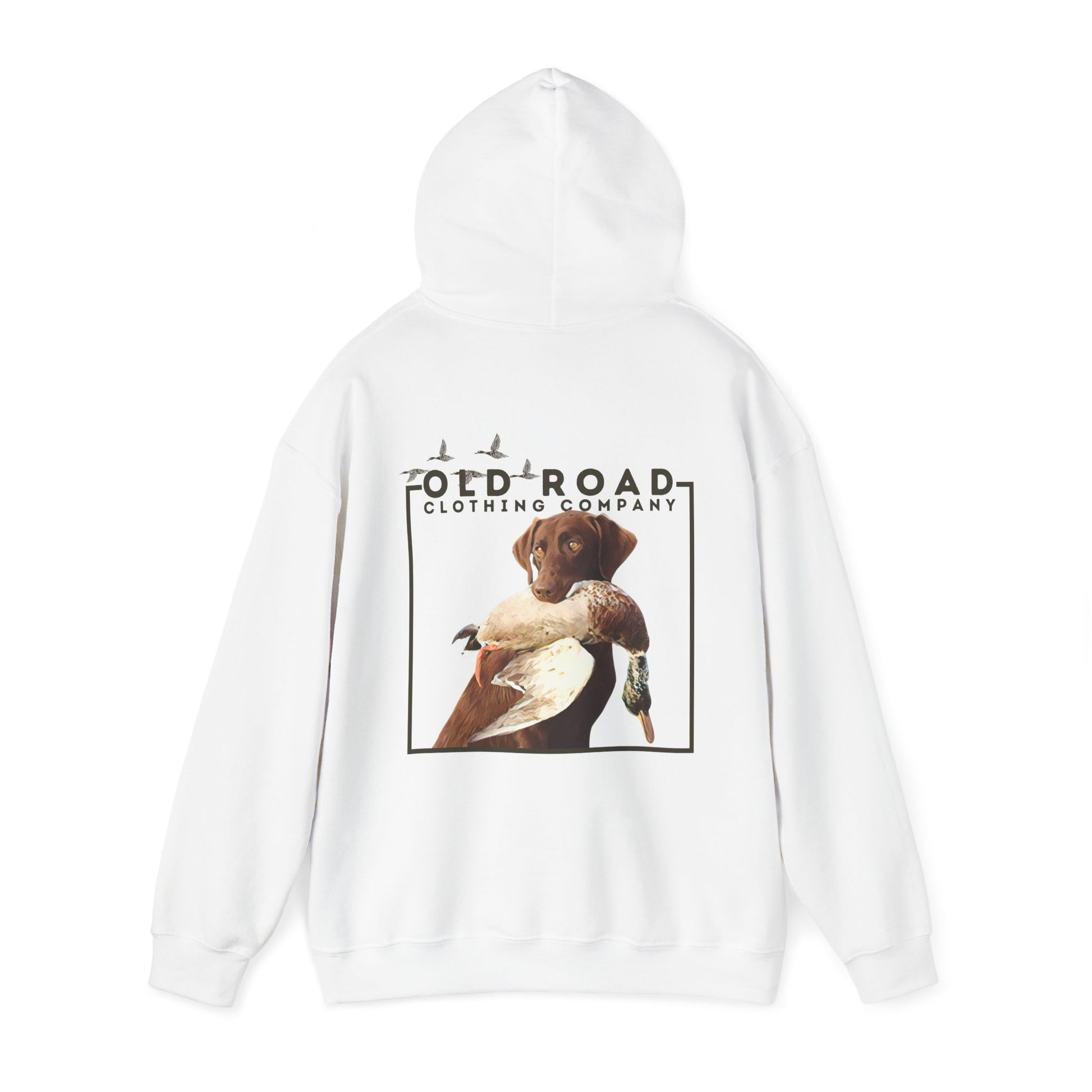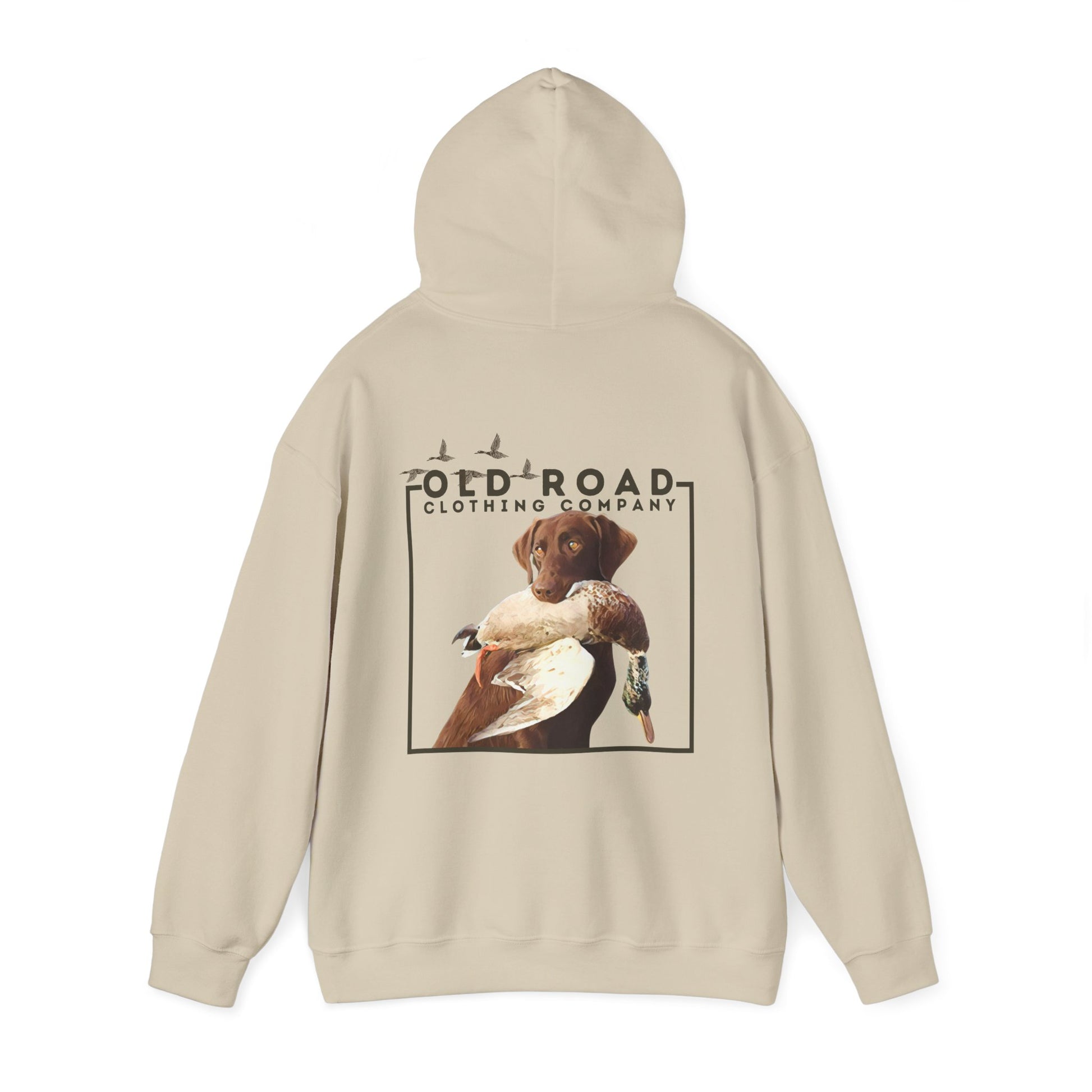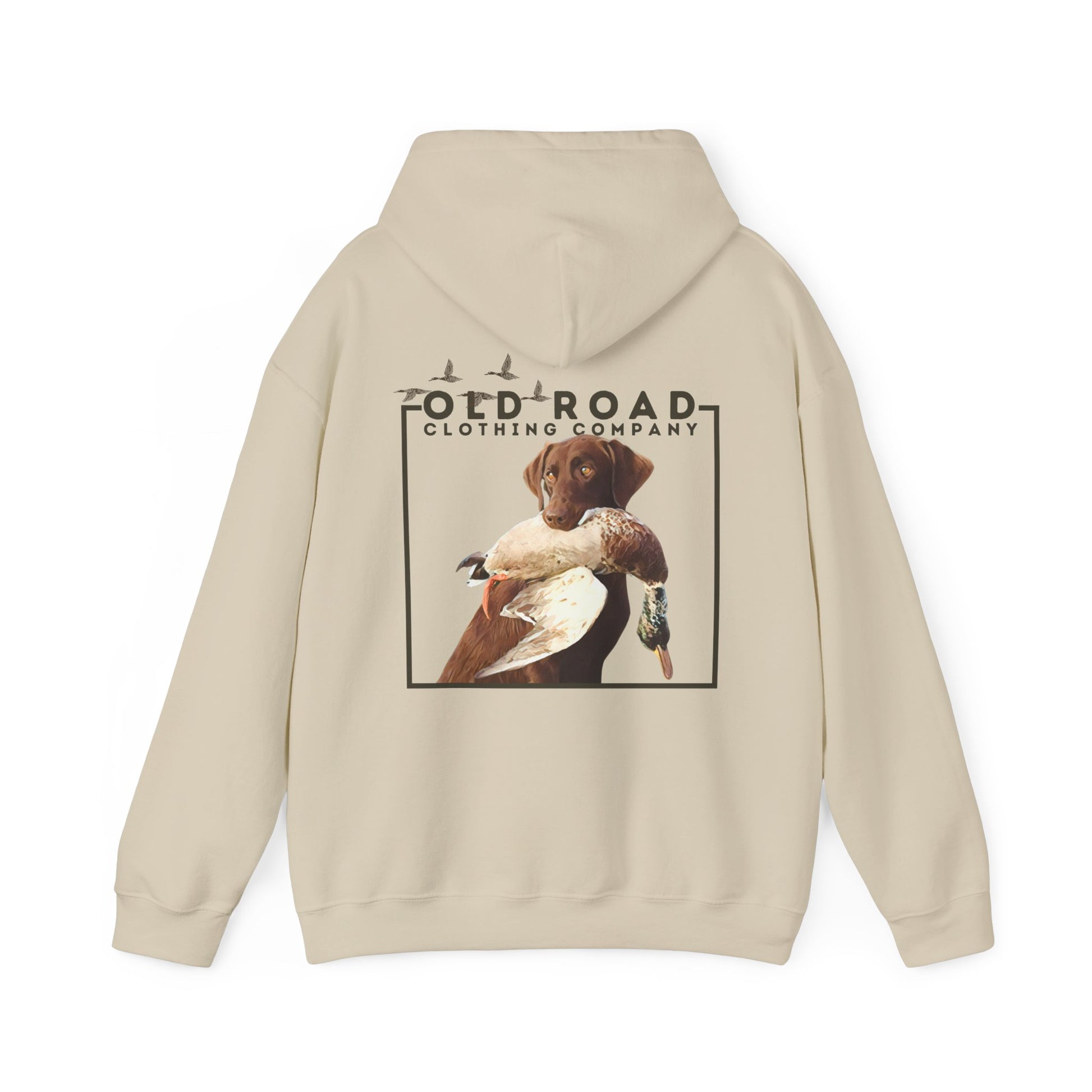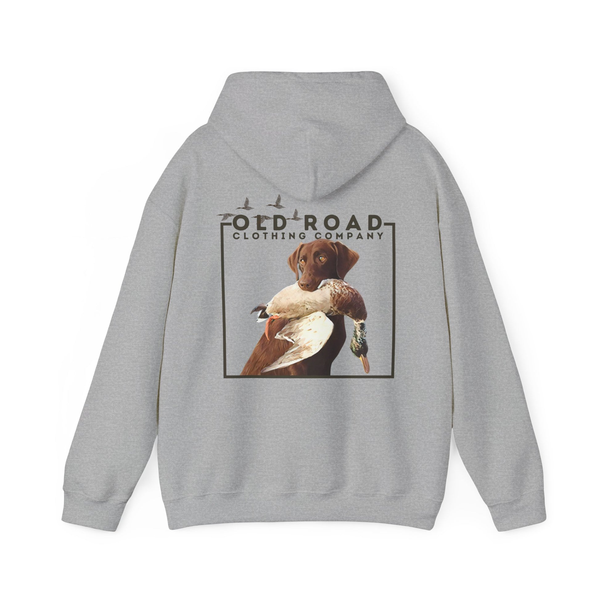 This hoodie has our Old Road Clothing Company logo on the front of the hoodie and on the back of the hoodie there is a chocolate Labrador Retriever holding a duck in its mouth. This would be a perfect gift for a duck hunter or a Labrador lover!