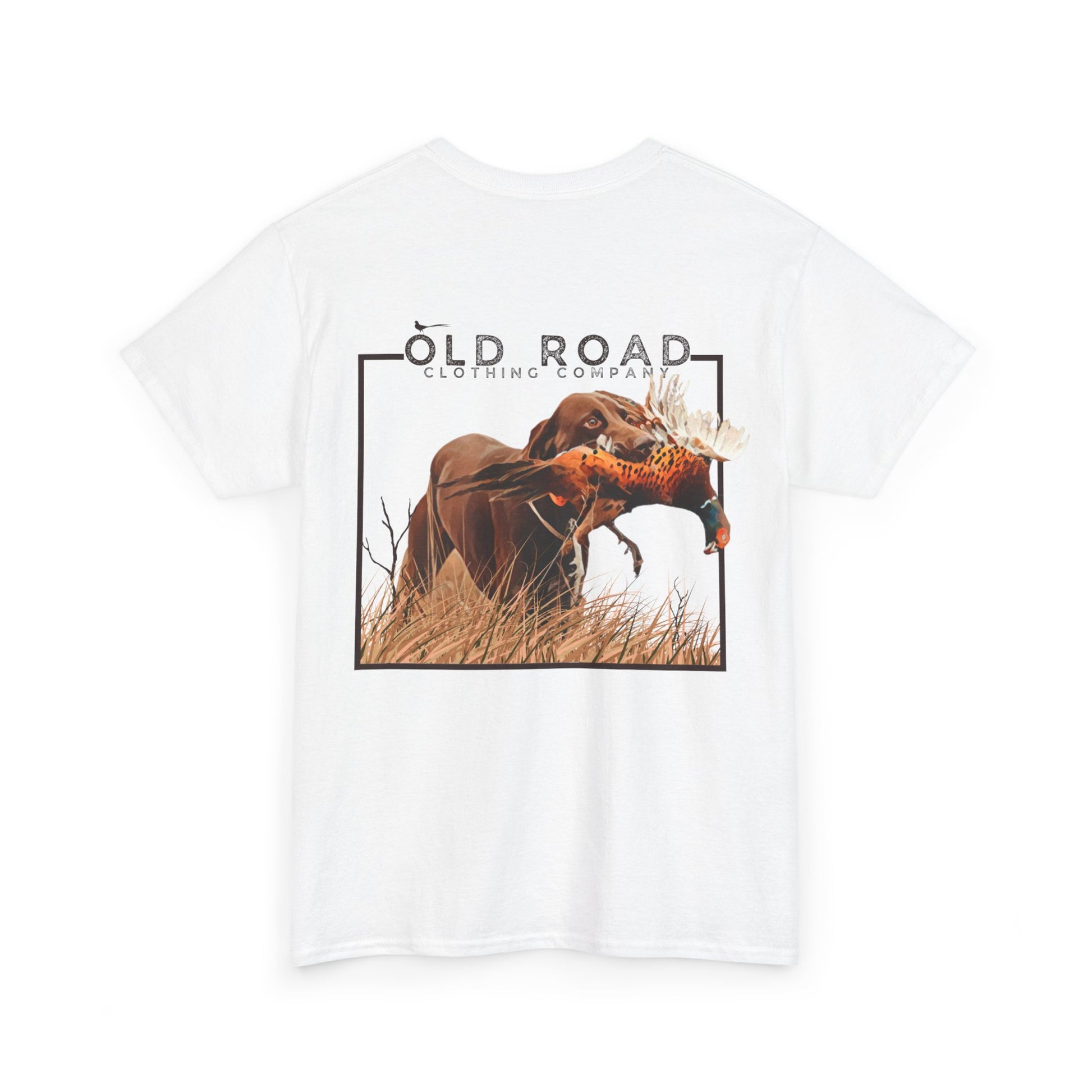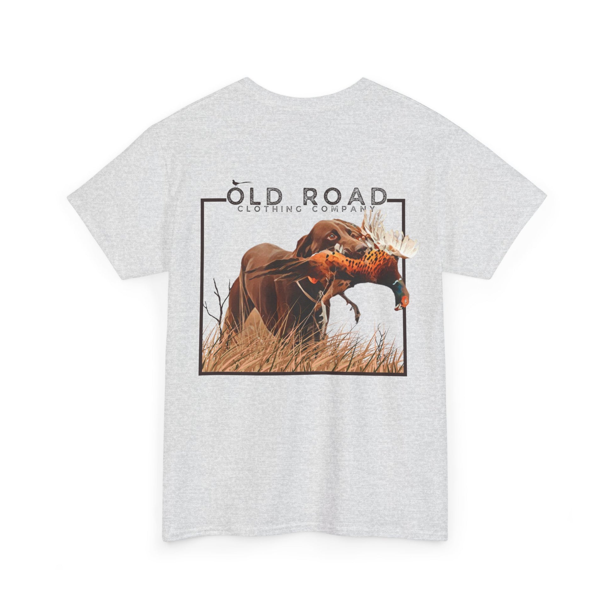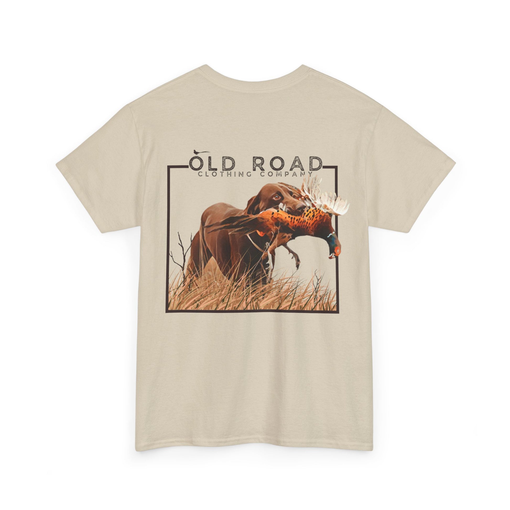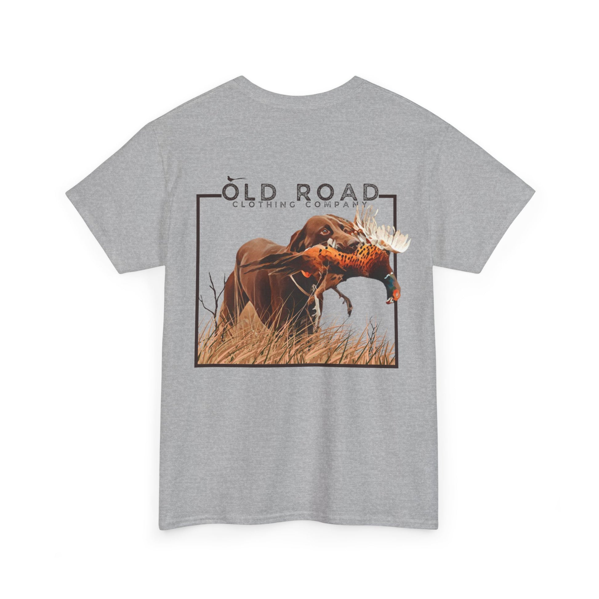 This shirt has a Labrador Retriever retrieving a pheasant on the back and our Old Road Clothing Company logo on the front. **Unisex Gildan Shirt please review size chart.