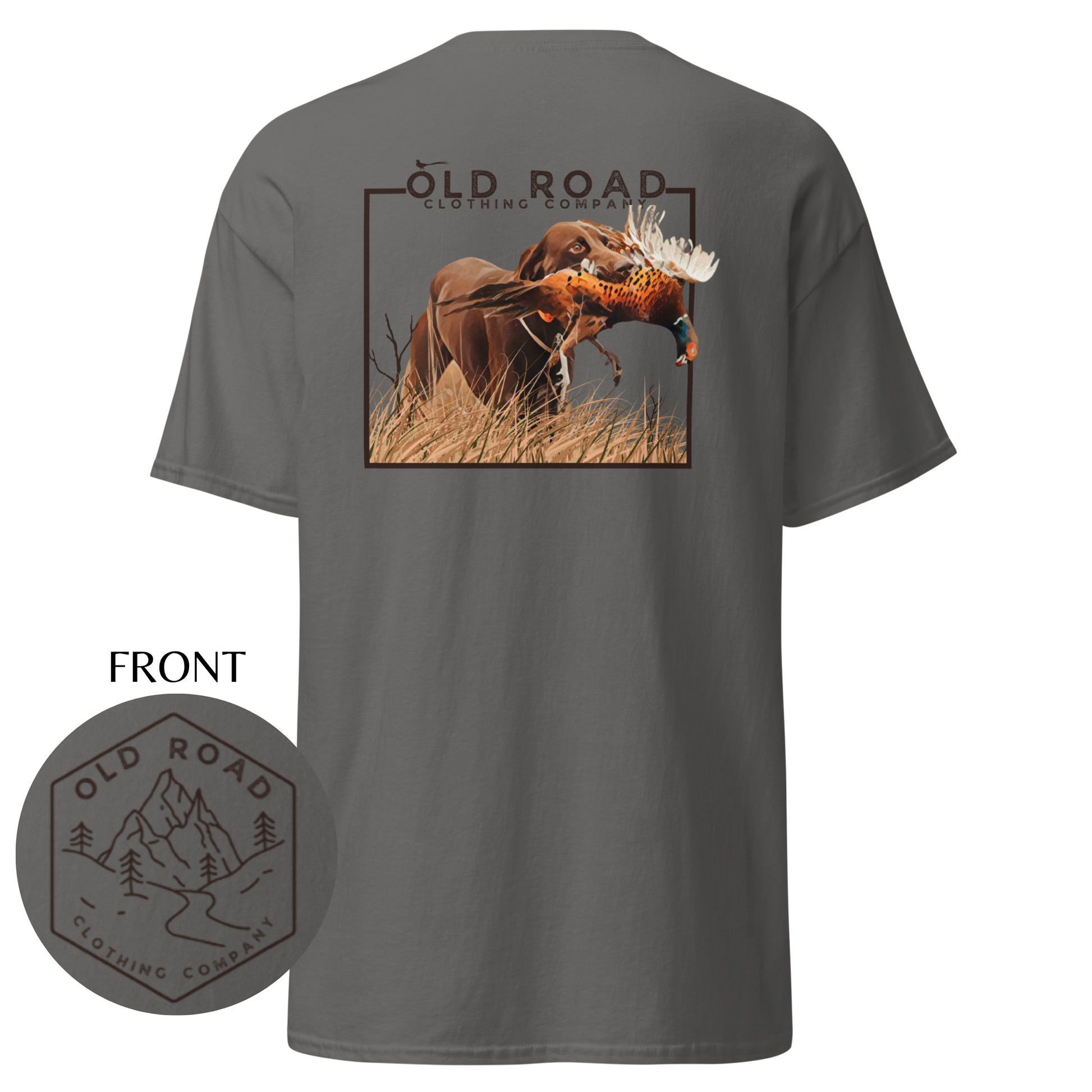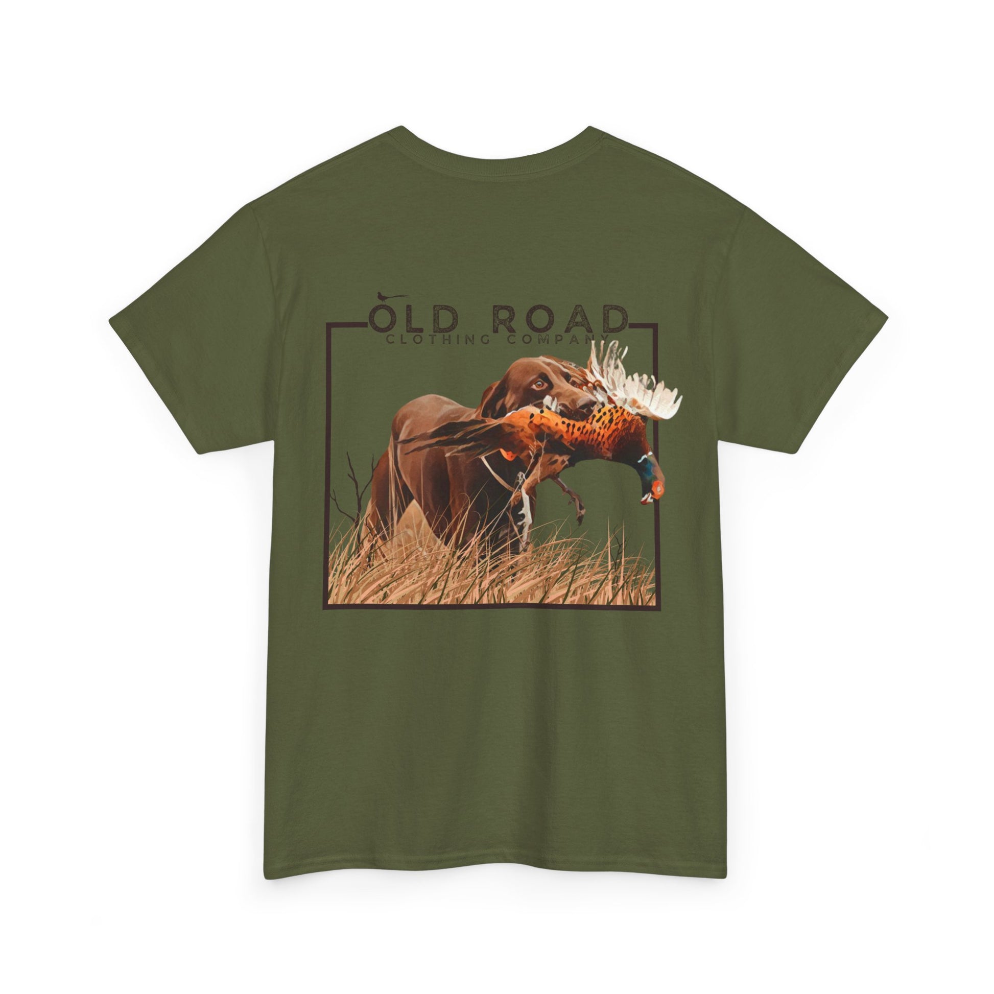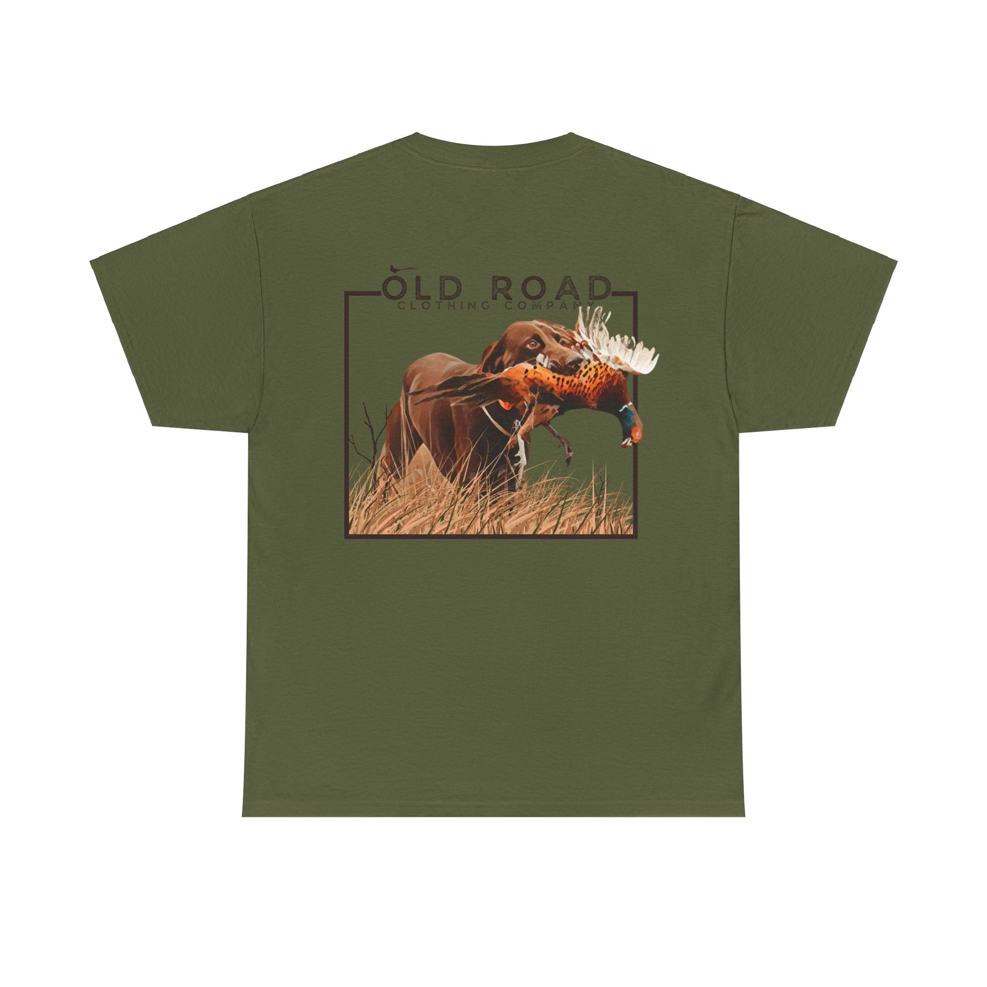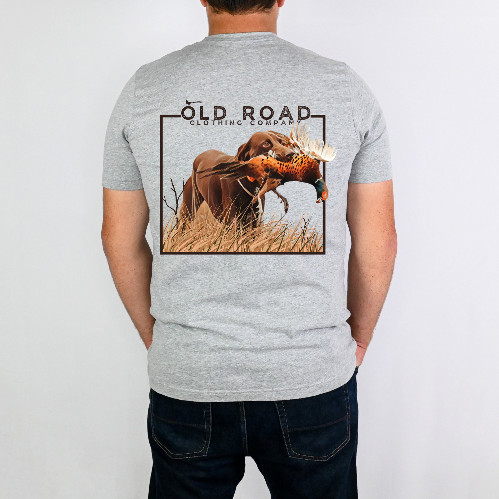 This shirt has a Labrador Retriever retrieving a pheasant on the back and our Old Road Clothing Company logo on the front. **Unisex Gildan Shirt please review size chart.