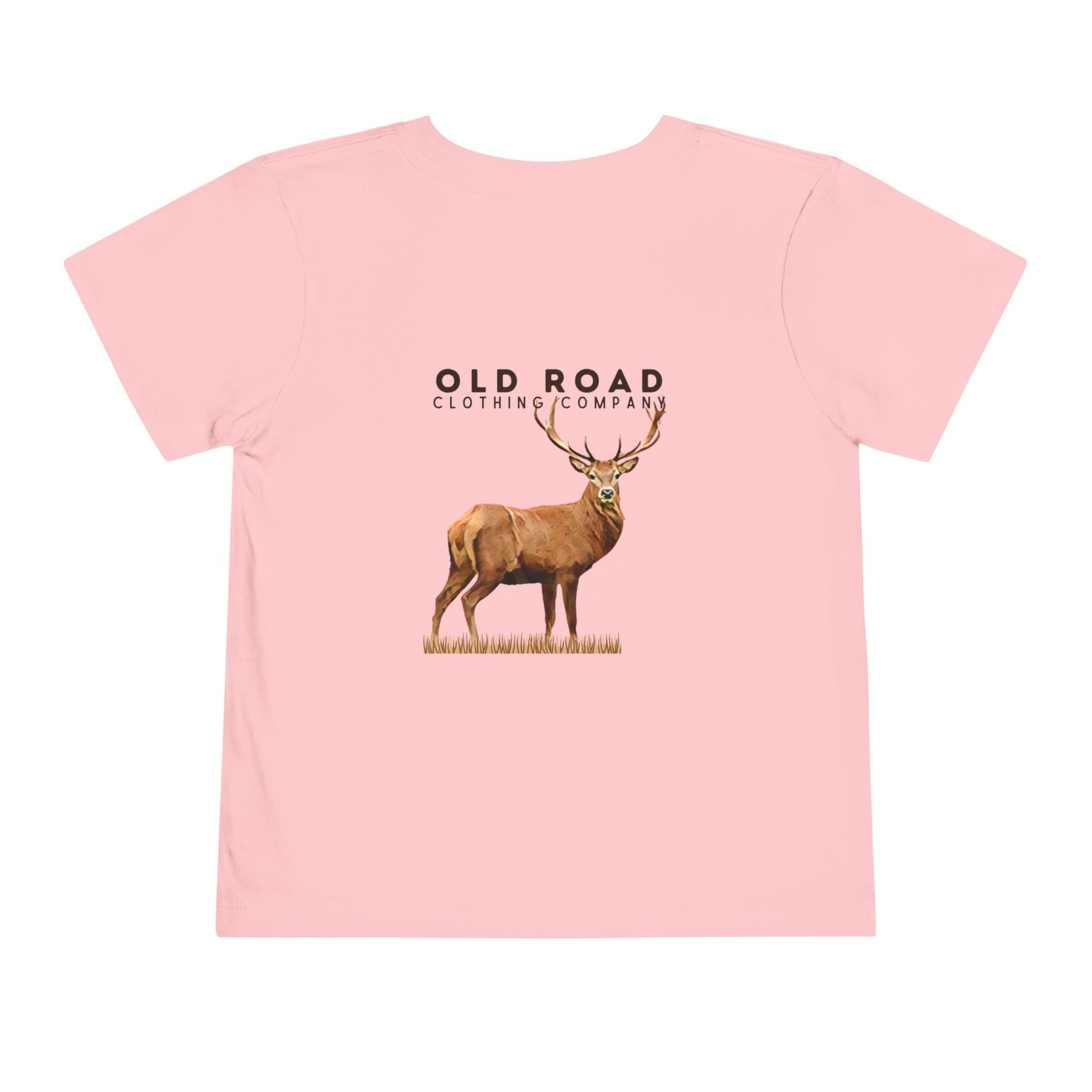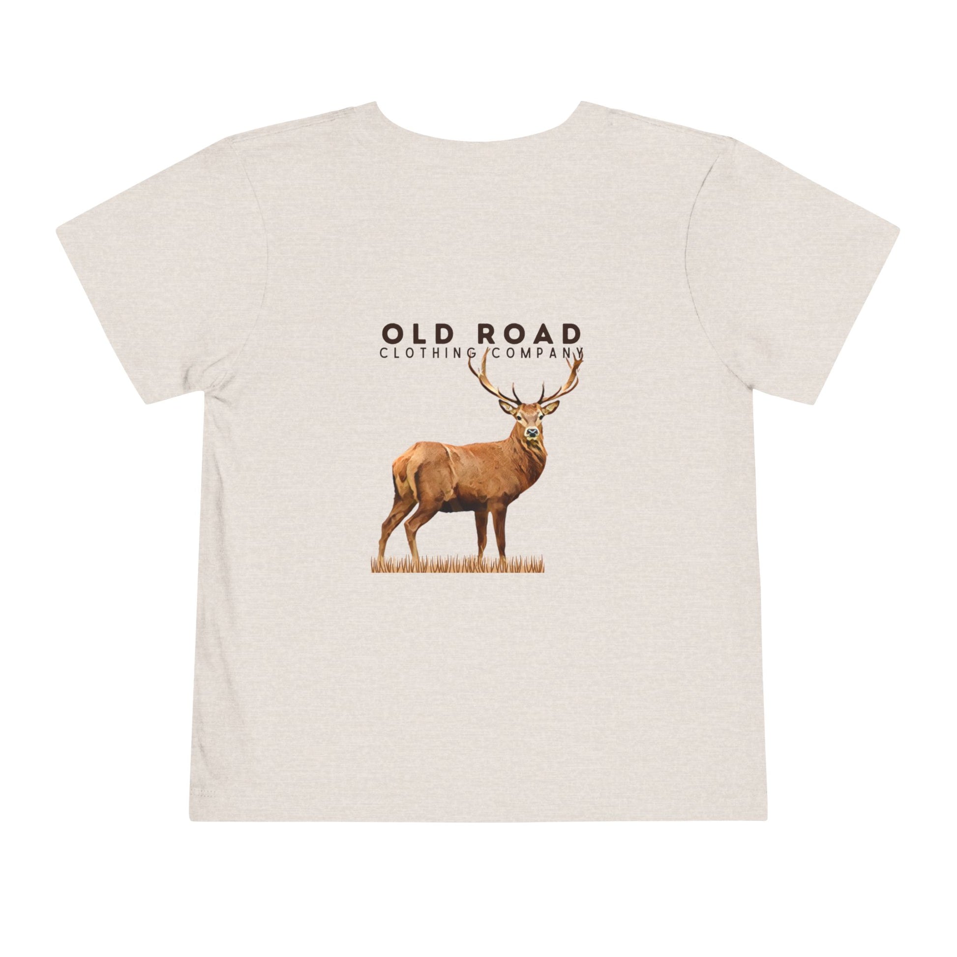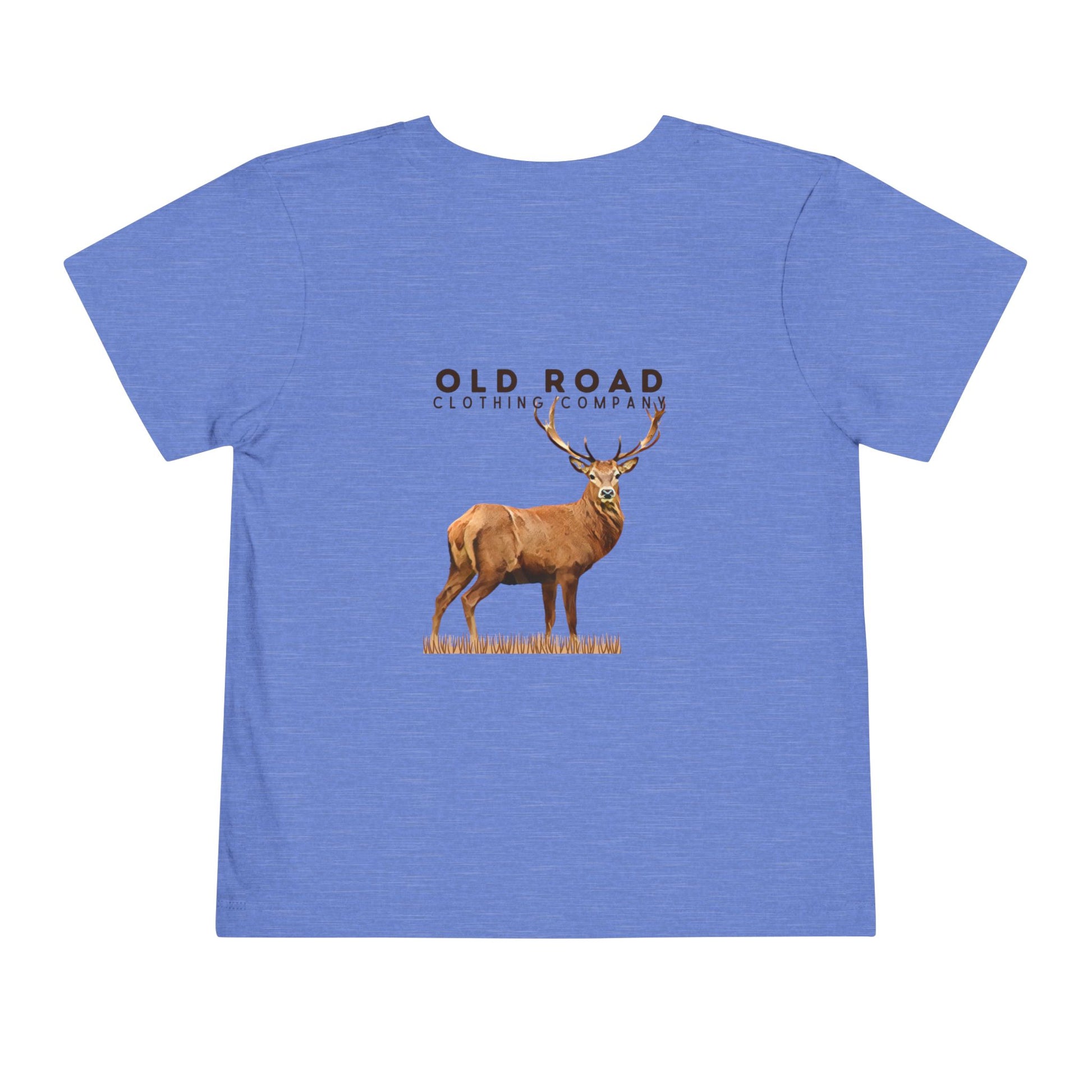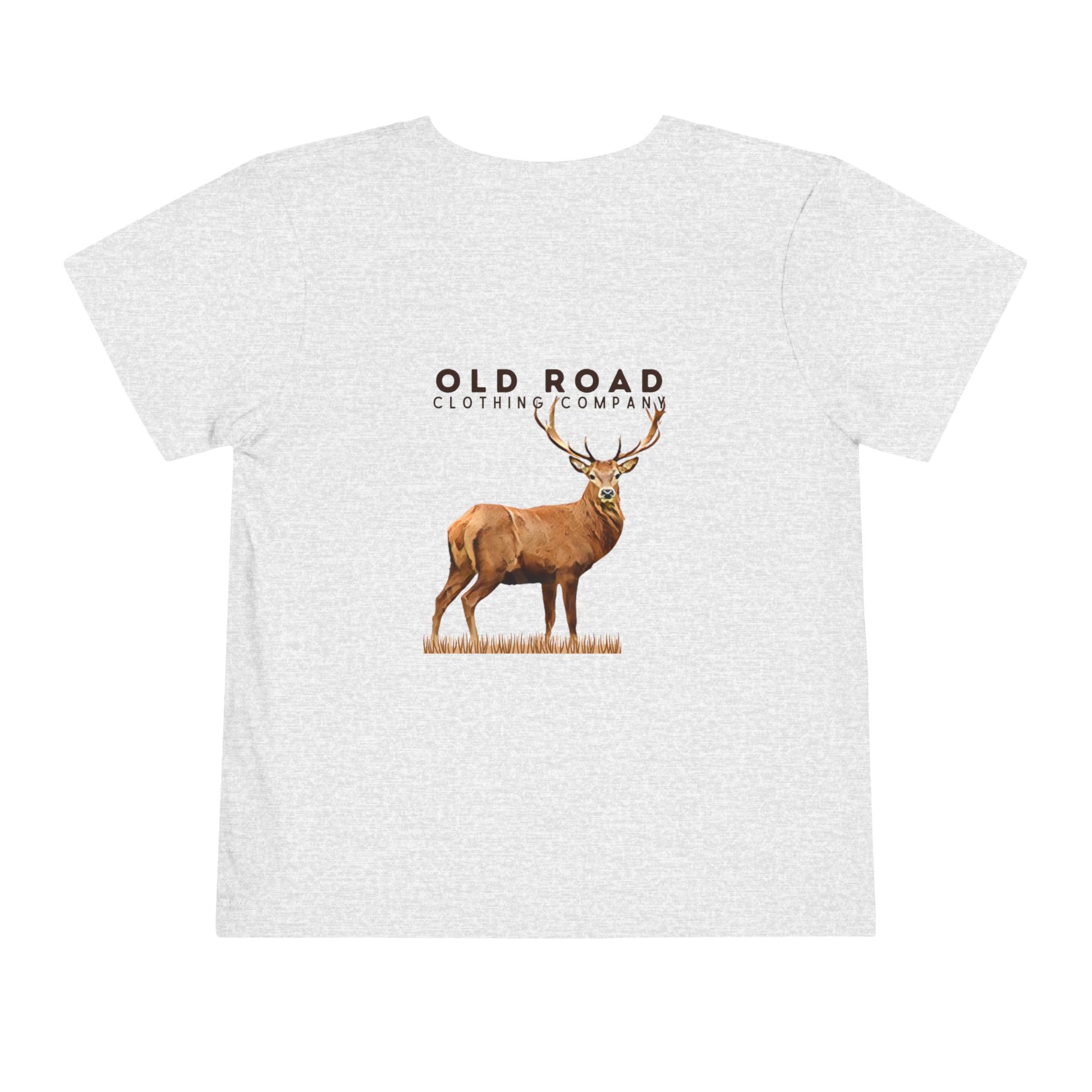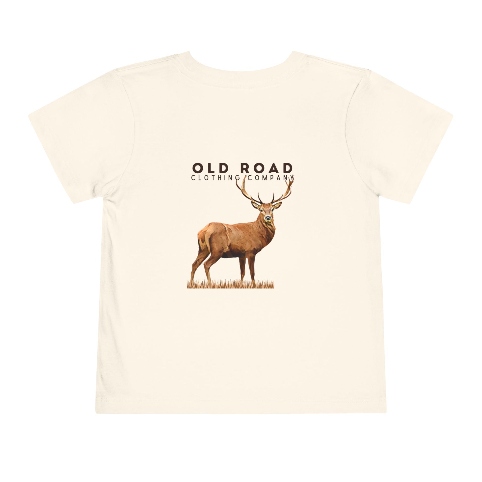 This t-shirt has a buck on the back looking and our Old Road Clothing Company logo on the front.