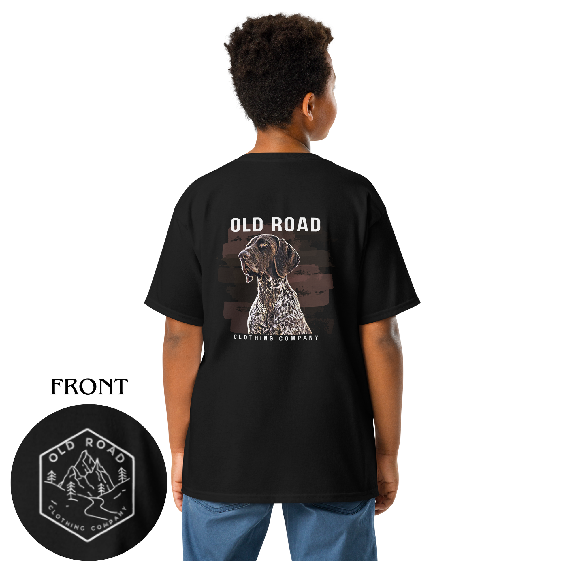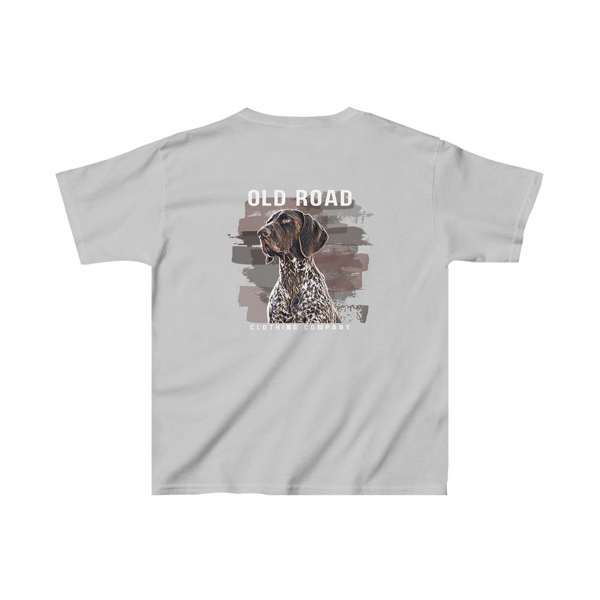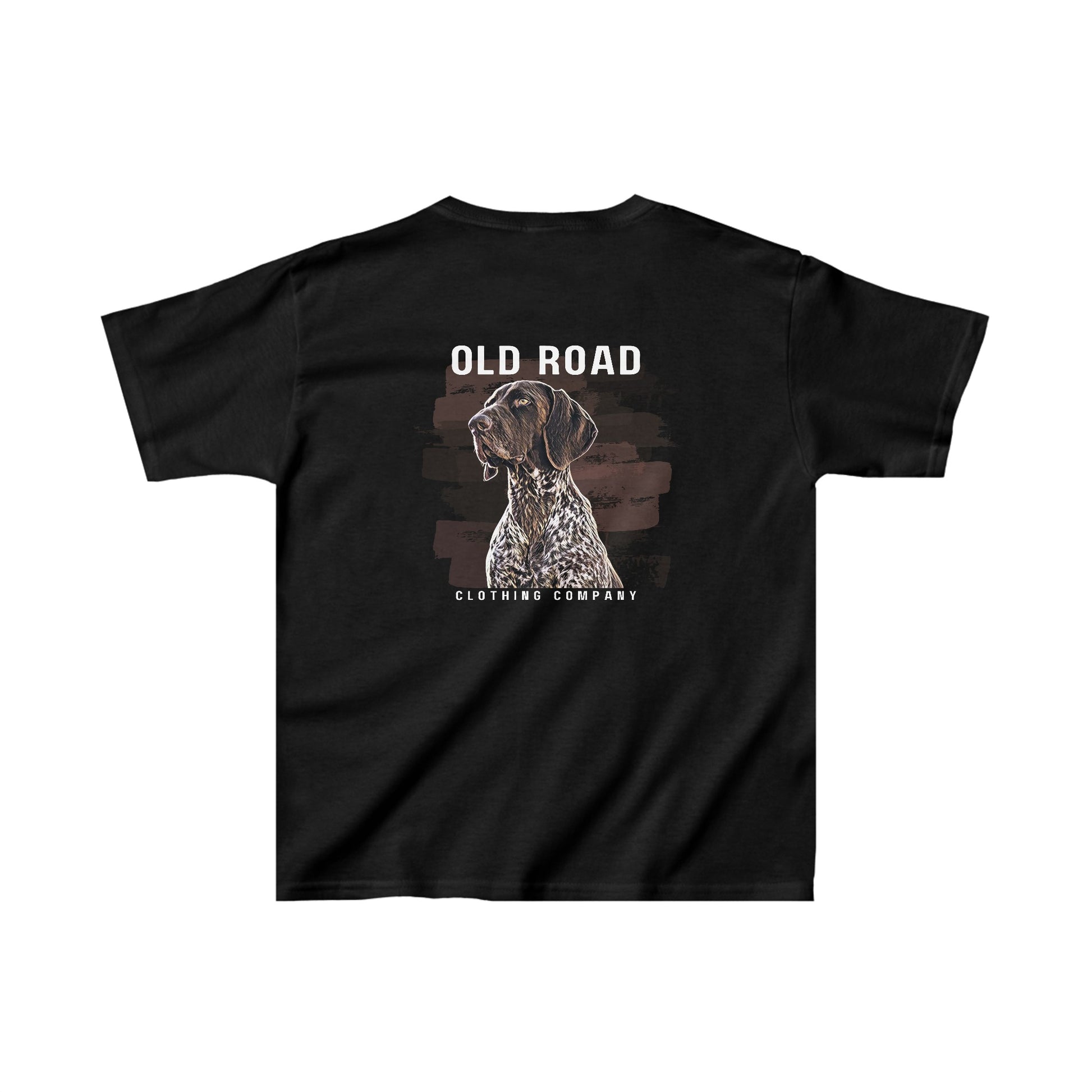 This is a youth T shirt. On the front of this shirt we have our Old Road Clothing Company logo in white. On the back there is a German Shorthaired Pointer looking up with a distorted background. Unisex sizing, please review size chart before purchasing.